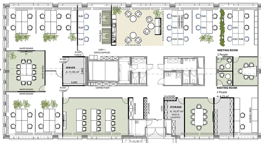 Kancelářské prostory jsou rozděleny na menší celky openspace, menší i větší meetingové místnosti a menší konferenční centrum. Součástí interiéru je prostorná designová kuchyňka. Prostor se nabízí s nábytkem (po domluvě). Přikládáme plánek celého prostoru a fotografie aktuálního stavu.