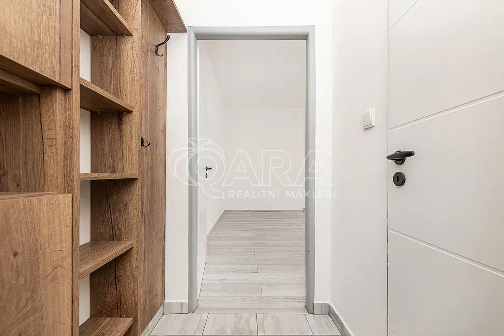 Na chodbě najdete praktické police vyrobené na míru, které efektivně řeší úložný prostor.