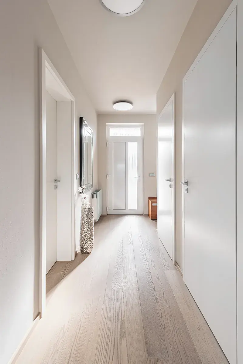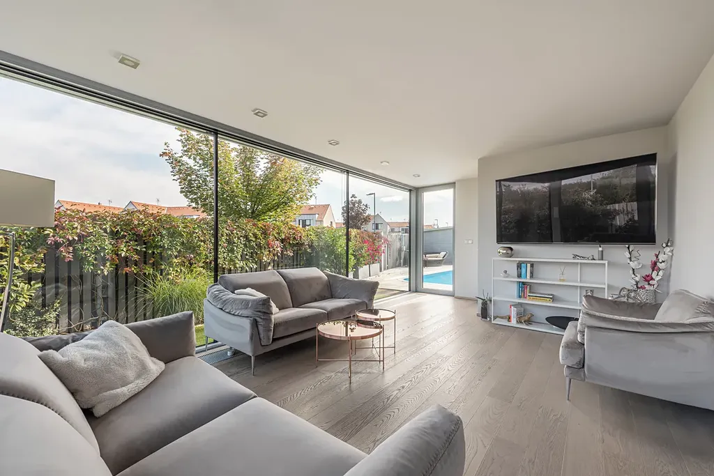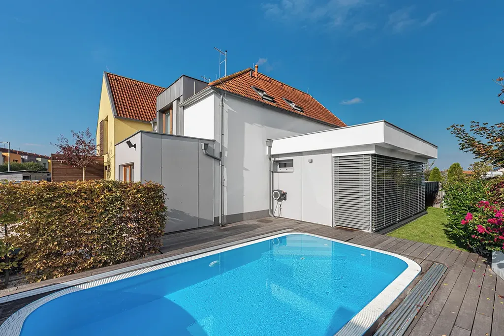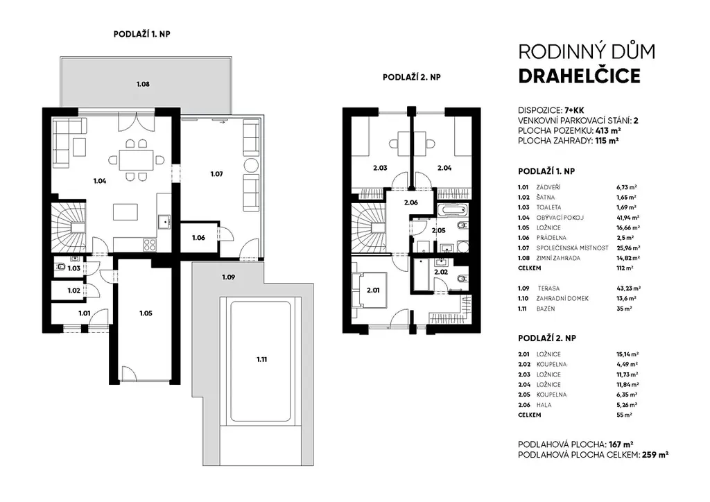 Nadstandardní rodinný dům o dispozici 7+kk a užitné ploše 167 m² se nachází v klidné rezidenční části obce Drahelčice, pouhých několik minut od Prahy. Nemovitost nabízí harmonické propojení moderní architektury, precizního zpracování a komfortu rodinného bydlení s důrazem na detail, funkčnost i estetiku. Dominantou přízemí je světlý obývací pokoj s krbem a kuchyní vybavenou spotřebiči Miele a vinotékou, plynule navazující na zimní zahradu a společenskou místnost s celoskleněnými stěnami, které otevírají interiér do pečlivě udržované zahrady. Součástí přízemí je dále vstupní hala s šatnou a vestavěnými skříněmi, toaleta, ložnice a samostatná prádelna. Elegantní dřevěné schodiště s nerezovým zábradlím vede do patra, kde se nachází hlavní ložnice s vlastní koupelnou, dva dětské pokoje a druhá koupelna s vanou a dvojumyvadlem.  K vysokému standardu vybavení patří dřevěné podlahy v dekoru šedého dubu, bezfalcové dveře v bílém laku, hliníková a plastová okna s trojsklem, designové koupelny s italskou keramikou a sanitou Hansgrohe, venkovní žaluzie a vytápění kombinující podlahové topení, konvektory a radiátory s plynovým kotlem. Komfortní zázemí této výjimečné nemovitosti doplňují venkovní terasy z exotického dřeva massaranduba, vyhřívaný bazén se slanou vodou (8×4 m) s protiproudem a zastřešením, elektricky ovládaná posuvná brána, zahradní domek a dvě venkovní parkovací stání na zpevněné ploše před domem. Pečlivě udržovaná zahrada nabízí maximální soukromí, klid a příjemné posezení. Drahelčice jsou oblíbenou rezidenční lokalitou s rychlým spojením do Prahy a plnou občanskou vybaveností. V blízkosti se nachází mateřská a základní škola, sportoviště, restaurace, dětská hřiště i přírodní okolí vhodné pro rekreaci. Do centra Prahy se pohodlně dostanete autem do 20 minut nebo MHD – zastávka je v docházkové vzdálenosti.