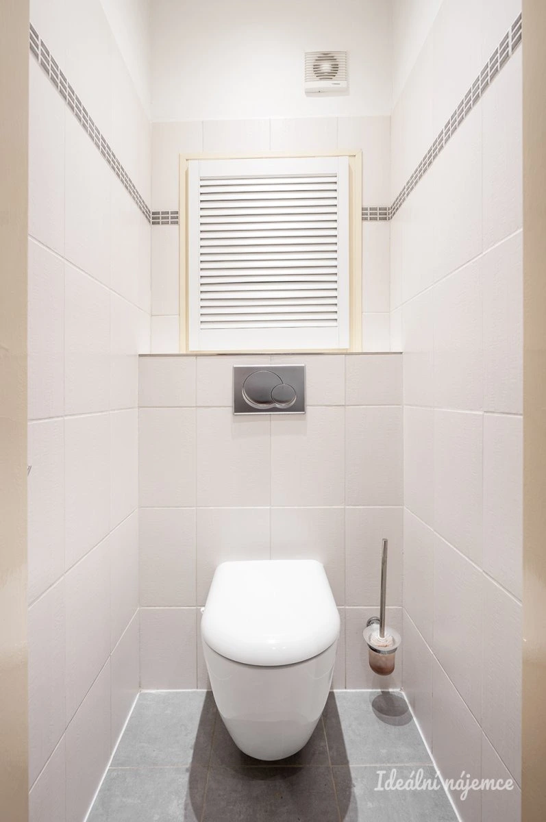 V koupelně se nachází pračka a vana, toaleta je oddělená.