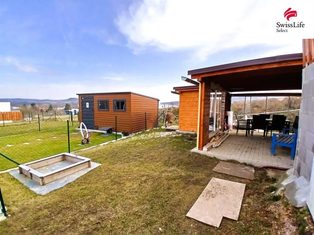 Benefitem oplocené zahrádky je pěkná, prosklená pergola s posezením a krásným výhledem do krajiny.