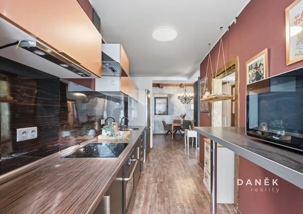 Prostor je vybaven klimatizací a elektrickými žaluziemi, které zajišťují komfortní užívání během celého roku. Střešní konstrukce je zateplena minerální vatou a podkroví prošlo úpravami zahrnujícími nové omítky i úpravy stropů, což prostoru dodává vzdušnost a útulnou atmosféru. Výsledkem je místo, které spojuje charakter historického domu s pohodlím moderního bydlení