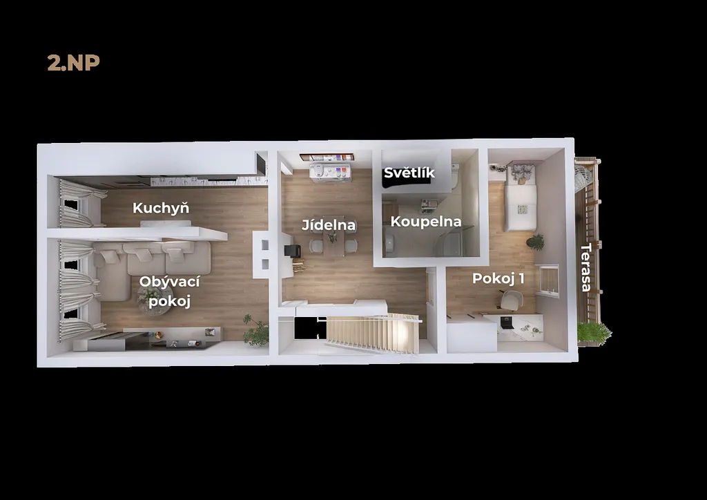 Dispozici dále doplňuje samostatný pokoj, koupelna s toaletou a vstup na menší terasu (12 m²), která poskytuje klidné venkovní zázemí přímo navazující na obytný prostor.