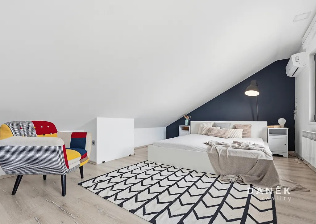 V podstřešní části domu vznikl mezonetový prostor využívaný jako další pokoj, který nabízí příjemné soukromí a oddělení od hlavního obytného dění. Díky své poloze působí tato část domu velmi klidně a přirozeně slouží jako odpočinková zóna.