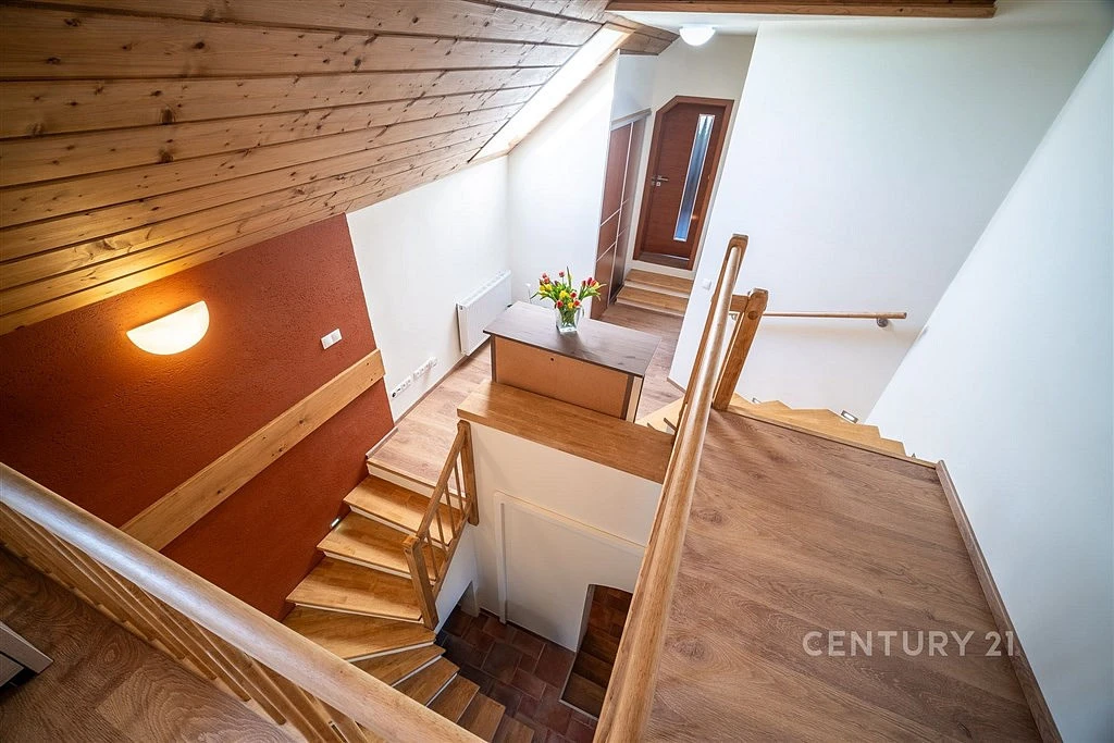 Podkroví je přístupné po krátkém schodišti vedoucím do prostorné haly s pracovnou, která tvoří hlavní komunikační prostor domu. Z haly je vstup do velké ložnice a protilehlého pokoje. Součástí podkroví je také prostorná koupelna vybavená vanou, sprchovým koutem, umyvadlem a toaletou.