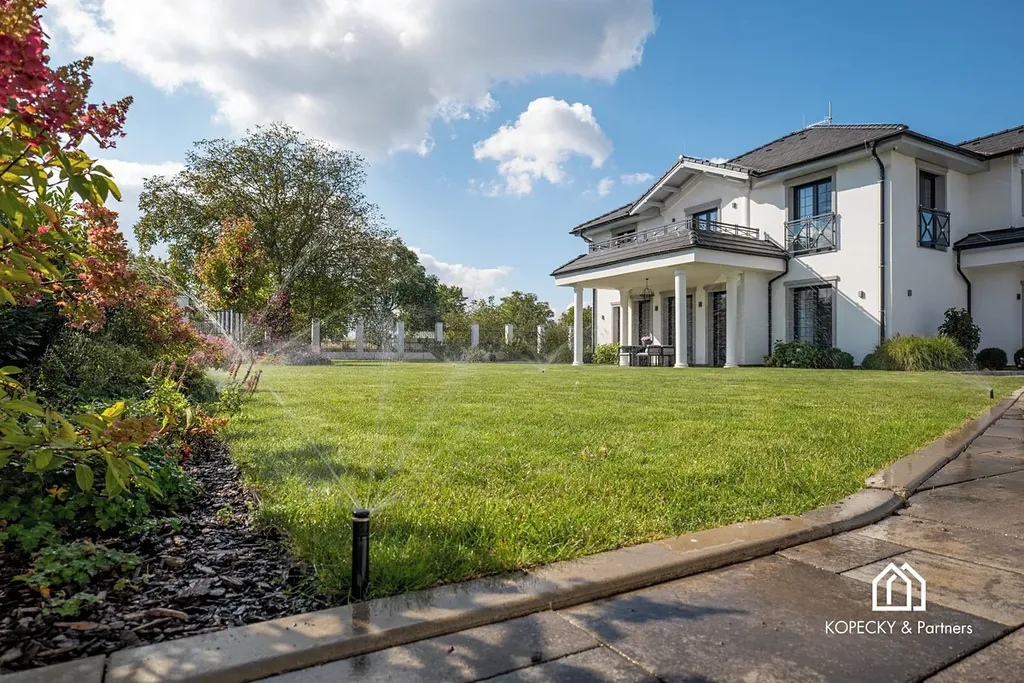 Na profesionálně udržované zahradě najdete zastřešený bazén 8×4 m se slanou vodou, zavlažovací systém, vrtanou studnu a zahradní domek. Parkování je zajištěno v dvojgaráži a na dalších plochách až pro 7 automobilů, včetně přípravy na dobíjení elektromobilů.