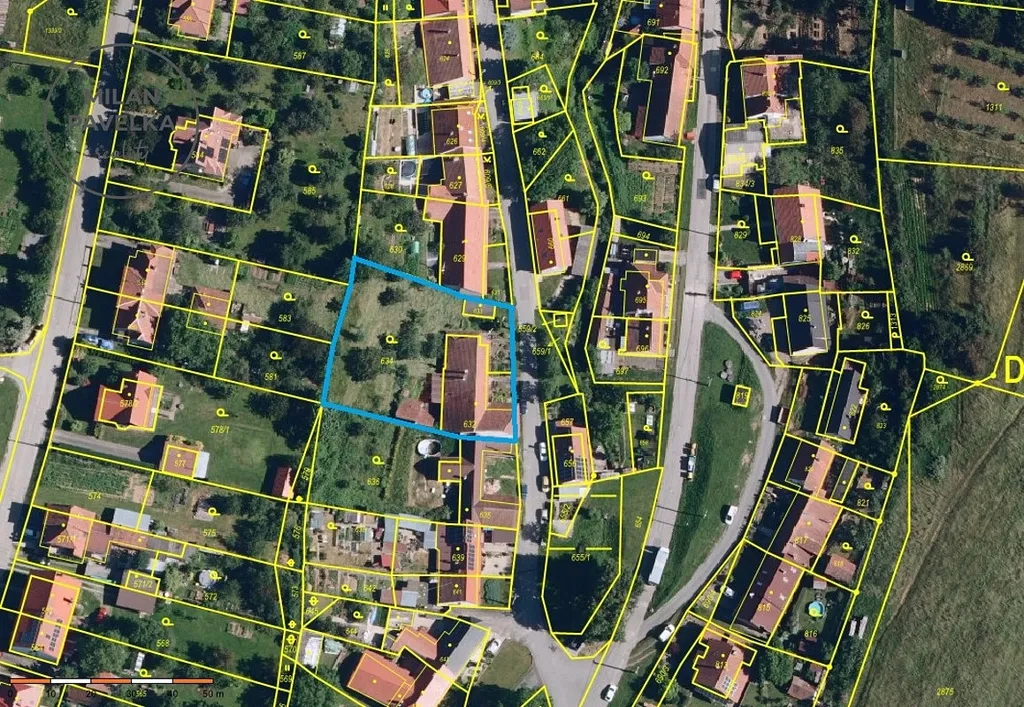 Celková plocha pozemku, který je svažitý na východní stranu má výměru 1542 m², zastavěná plocha domu je 180 m². Dispozice domu v půdorysu.