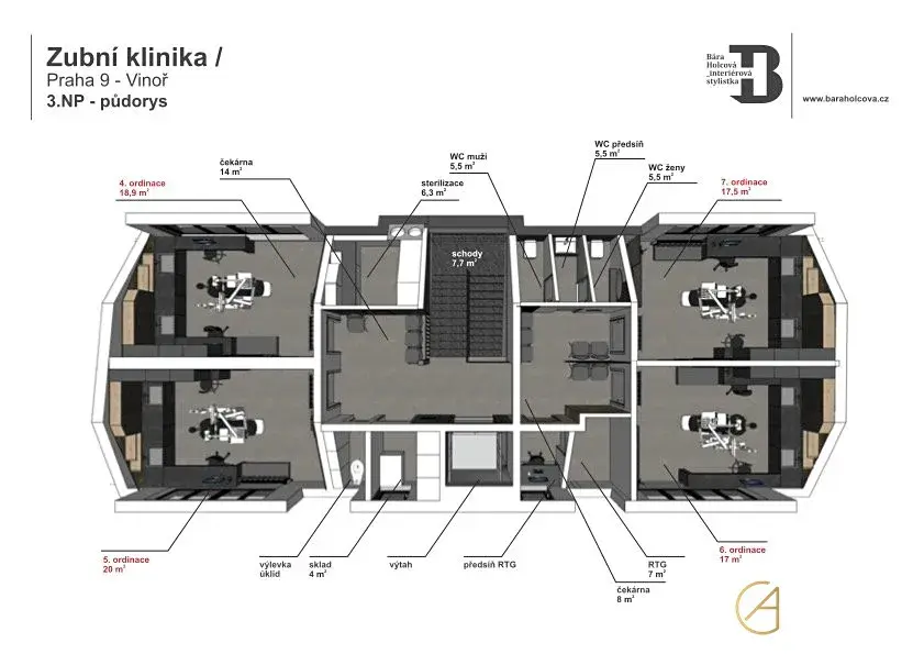 Nabízené prostory se rozkládají na dvou podlažích a nabízejí celkem sedm prostorných a moderně navržených ordinací. Při vstupu vás přivítá recepce s profesionálním designem a čekárna, které zanechají perfektní první dojem na vaše klienty. Součástí prostor je také rentgenová místnost (přizpůsobeno pro ortodoncii), sterilizace, šatna a denní místnost pro zaměstnance, která zajistí pohodlí a zázemí pro váš tým. Ve všech místnostech je příprava na klimatizace a samozřejmostí je také výtah, který zajistí bezbariérový přístup.