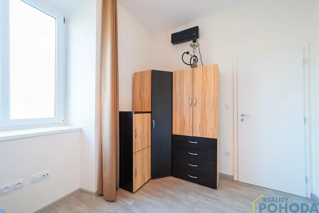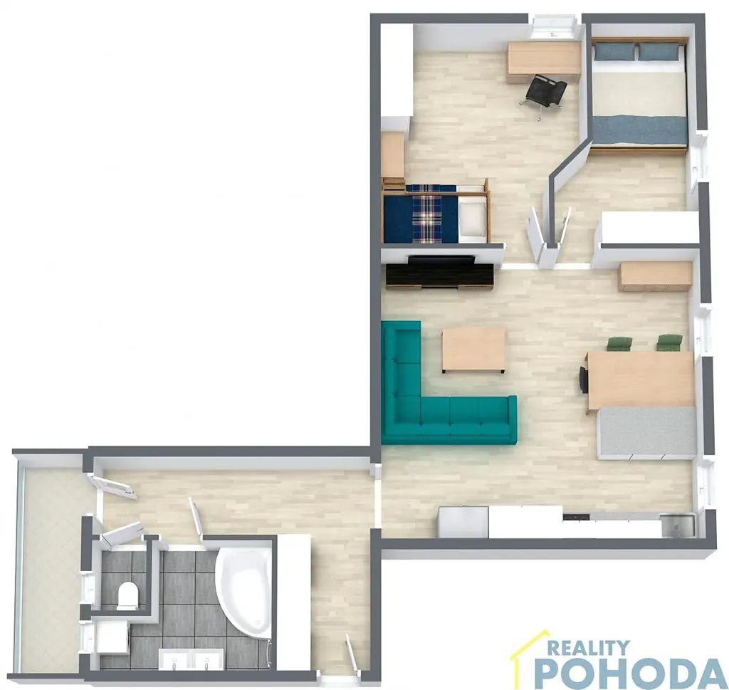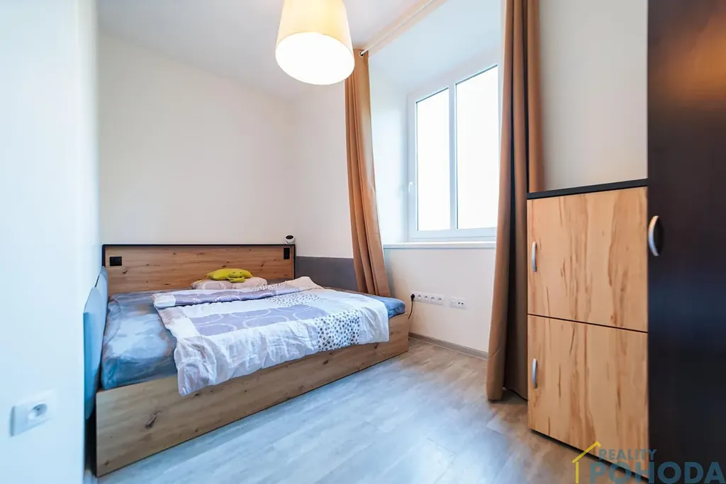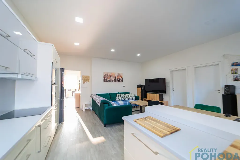 Aktuálně se byt skládá z velké vstupní verandy, prostorného obývacího pokoje s kuchyňskou linkou na míru včetně vestavěných spotřebičů (trouba, mikrovlnka, myčka) a stylovým kameninovým dřezem. Dále jsou zde dva pokoje a krásná koupelna s rohovou vanou, dvojumyvadlem a prostorem pro pračku i sušičku. Toaleta je samostatná. V obytných místnostech je položena kvalitní vinylová podlaha, zatímco koupelna a toaleta jsou řešeny dlažbou. Plastová okna s moderními roletkami směřují do zeleně, což bytu dodává příjemný pocit klidu a soukromí.