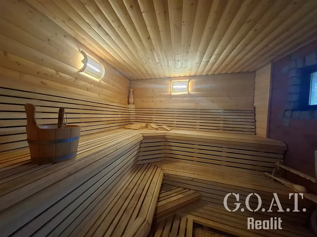 Stylový relaxační prostor s krbem a saunou – perfektní místo pro odpočinek po náročném dni.