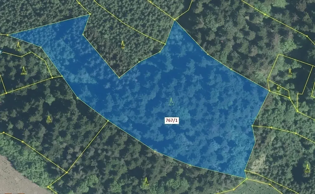 Lesní pozemek o výměře 12 637 m2, parcelní číslo 767/1, podíl 1/1, katastrální území Lačnov, obec Lačnov, obec s rozšířenou působností Vsetín, okres Vsetín, Zlínský kraj. Po těžbě.