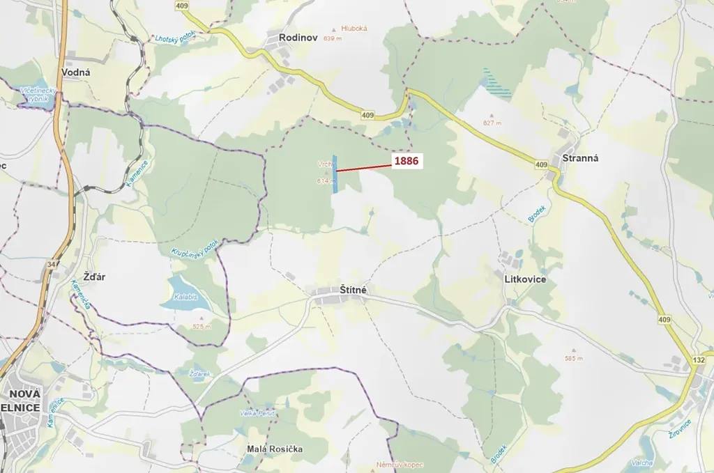 Lesní pozemek o výměře 19 314 m2, parcelní číslo 1886, podíl 1/1, katastrální území Štítné, obec Žirovnice, obec s rozšířenou působností Pelhřimov, okres Pelhřimov, Kraj Vysočina. Po těžbě.