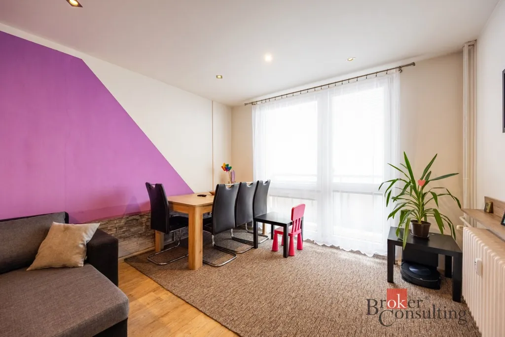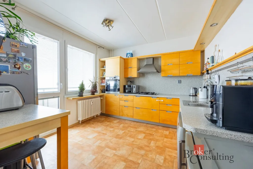 Dominantou bytu je velký a světlý obývací pokoj s jídelním koutem, který nabízí dostatek prostoru pro rodinná setkání i odpočinek. Na něj navazuje prostorná kuchyně s velkou kuchyňskou linkou, poskytující dostatek prostoru pro každodenní vaření.