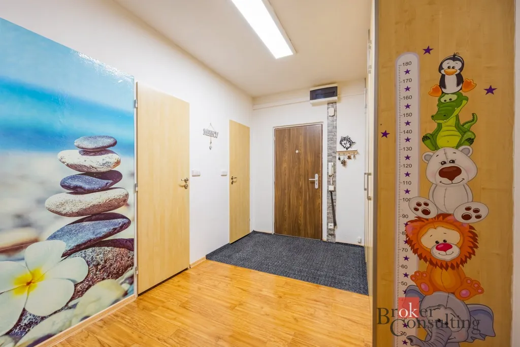 Dalšími místnostmi jsou komfortní ložnice a samostatný dětský pokoj, které poskytují dostatek soukromí i prostoru. Byt dále disponuje velkou vstupní chodbou, která působí velmi vzdušně a nabízí možnosti pro další úložné řešení. Praktickým bonusem je také komora, která zajišťuje další místo pro ukládání věcí.