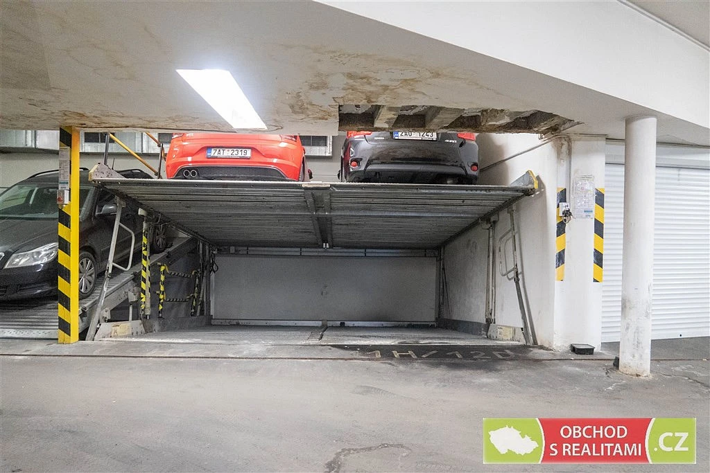 Společně s bytem je možné pronajmout garážové stání v zakladači (není vhodné pro SUV) v suterénu domu, cena je 1.000 Kč / měsíc.