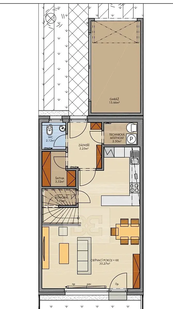 Dům je vybaven moderní, prostornou kuchyňskou linkou se spotřebiči – lednicí s mrazákem, indukční deskou, troubou, digestoří a myčkou. Obývací část nabízí pohodlnou pohovku, jídelní stůl, televizní stolek a televizi. V přízemí se dále nachází úložný prostor pod schody, technická místnost s pračkou a sušičkou, samostatná toaleta a šatna. Z obývacího pokoje je vstup na zahradu, která je částečně zastřešená a poskytuje ideální prostor pro odpočinek.