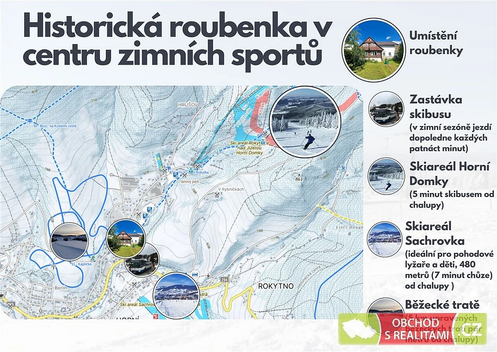 Nemovitost je zcela unikátní svým umístěním v jednom z největších lyžařských center v republice. Chalupa je ideální pro aktivní lyžaře, turisty i milovníky hor, kteří si chtějí užít klid a pohodu. V zimě uvítáte blízkost zastávky skibusu, která je vzdálená jen pár kroků. Pohodoví lyžaři a děti mají velmi blízko sjezdovky s mírným svahem na Sachrově hřebenu (480 metrů, 7 minut chůze). Aktivní lyžaři mají téměř za okny Skiareál Horní Domky (850 metrů, 15 minut chůze, 5 minut skibusem, který staví u chalupy). Tento skiareál s převýšením téměř 700 metrů nabízí jednu z nejdelších sjezdovek v republice (3 185 metrů), 7 vleků a 2 lanové dráhy. V těsné blízkosti chalupy (cca 500 metrů) také začínají trasy pro běžecké lyžování s nádhernými výhledy. Chalupa je také výchozím bodem pro mnoho letních turistických tras, které vás provedou krásnou krkonošskou přírodou.