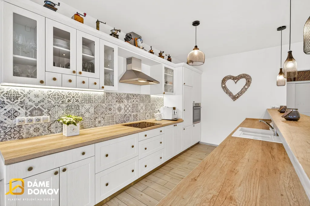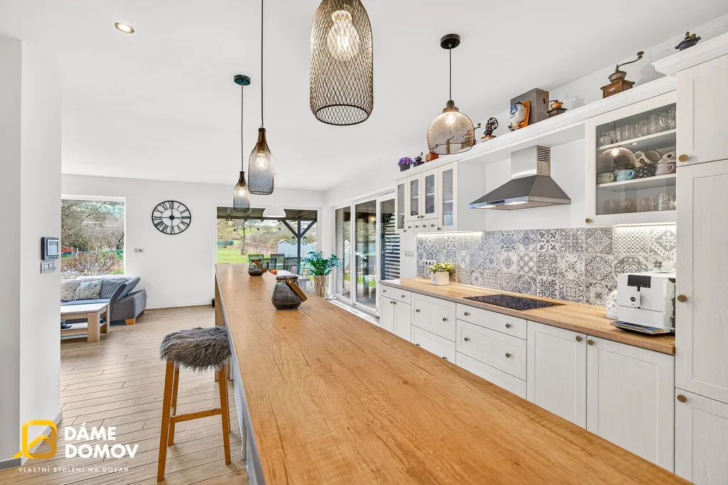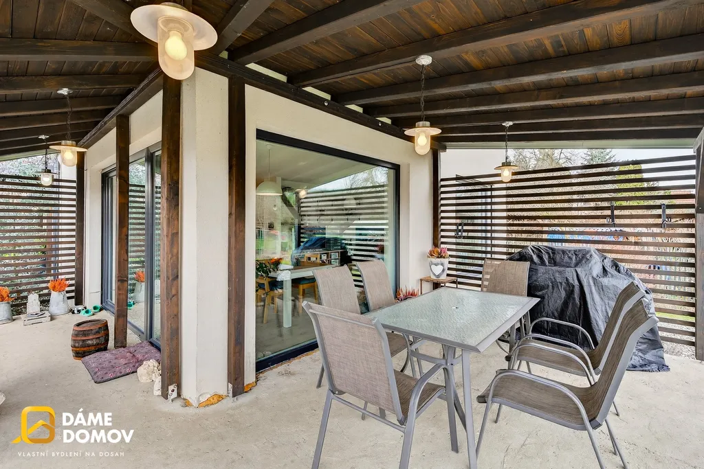 Dům je zděný, zateplený, okna s izolačními 3-skly, venkovní žaluzie, podlahové vytápění, klimatizace, prostorná kuchyňská linka na míru s vestavěnými spotřebiči a barovým pultem.