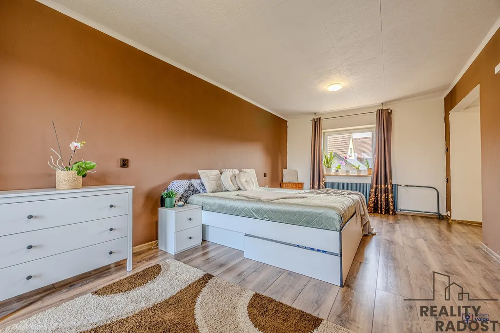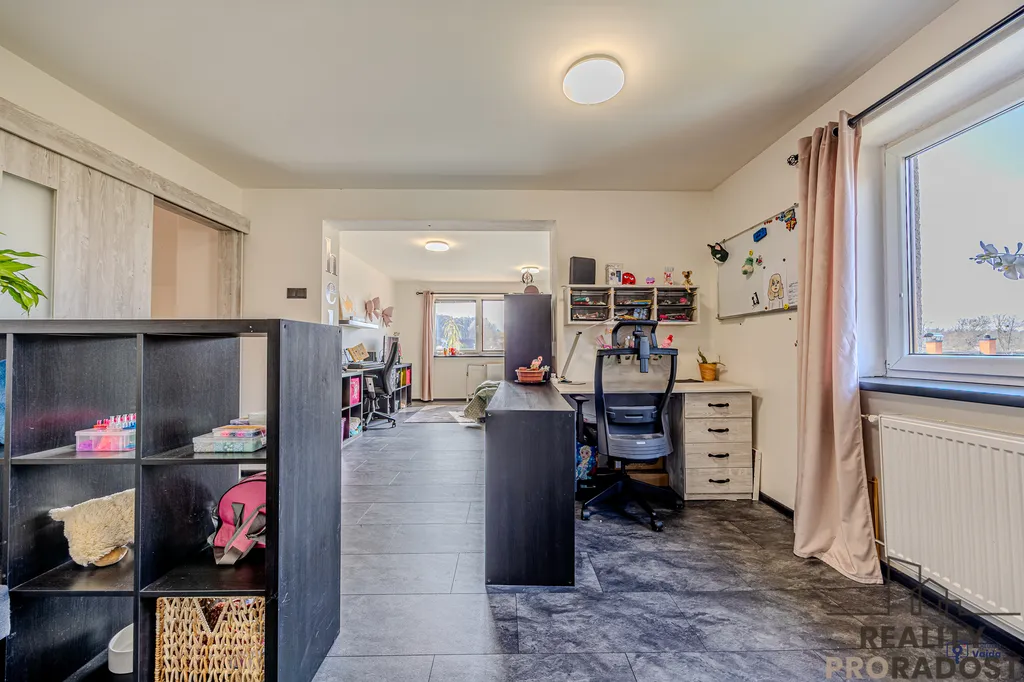 Obě nadzemní podlaží disponují bytovou jednotkou 3+1 + komora + sociální zázemí, kdy v současné době rodina obývá celý dům, jeden pokoj v přízemí slouží jako šatna a jeden pokoj v 1.patře slouží jako prádelna. Při vhodné rekonstrukci a dodělání kuchyně v 1.patře, je však možné využít rodinný dům jako dvougenerační. Z obývacího pokoje v přízemí je vstup na krytou terasu, kterou si jistě užijete od brzkých jarních do pozdních letních dní, stejně jako zahradu, kde zůstává dětský domeček, trampolína a bazén.