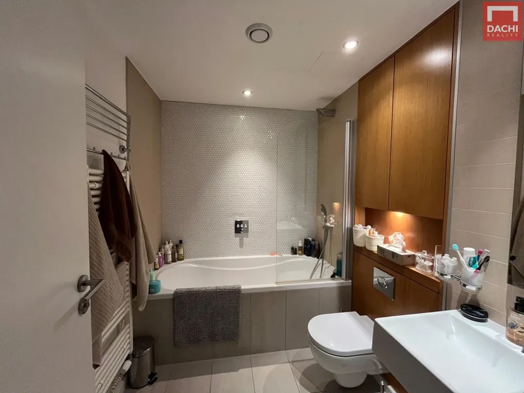 Součástí bytu je moderní kuchyňská linka s vestavnými spotřebiči, doplněná o pracovní desku Technistone. V lince je zároveň prakticky zabudovaná pračka se sušičkou, což přispívá k maximálnímu využití prostoru.