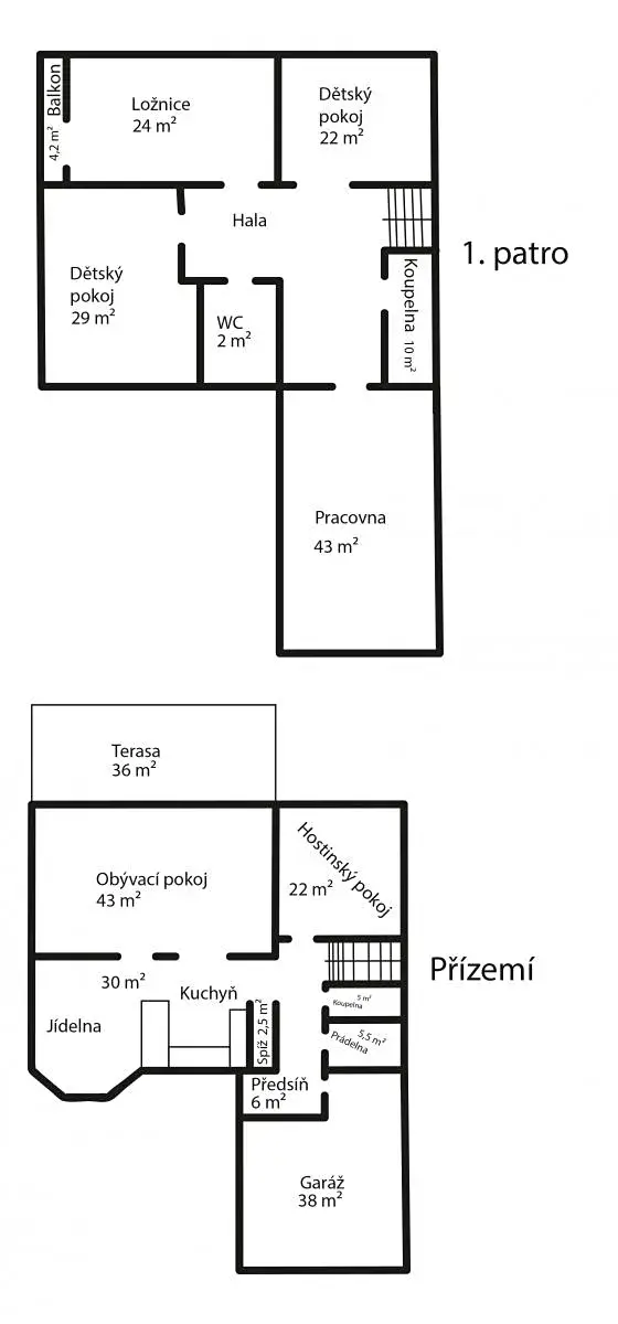 V patře domu tři ložnice: 2 dětské pokoje /pracovny (22, 30 m2) a ložnice rodičů (27m2) s balkonem a vestavěnými skříněmi. Dále prostorná (43m2) podkrovní místnost, vhodná jako domácí kancelář, dětská herna, další ložnice atp. Prosvětlená hlavní koupelna s vanou i sprchovými koutem. Toaleta je umístěna zvlášť.