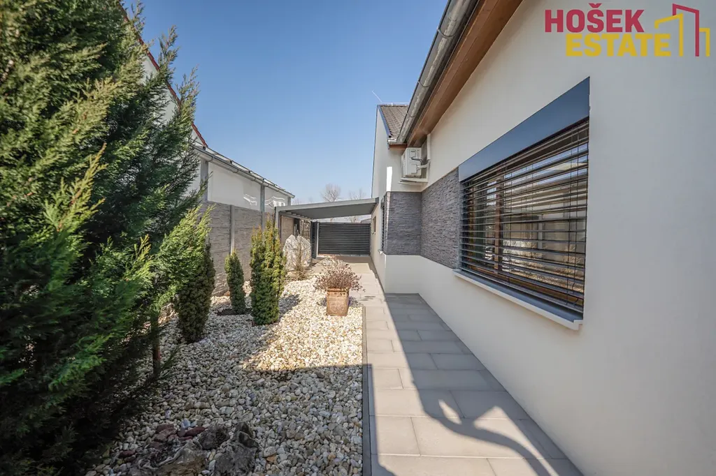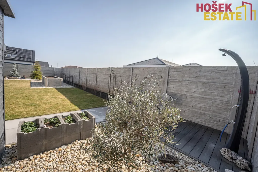 Velkou výhodou je také prostorná zahrada o velikosti přibližně 536 m², která poskytuje dostatek místa pro relaxaci, rodinné aktivity. Zahrada je vybavená bioklimatickou pergolou, prostornou terasou na které může stát vířivka.