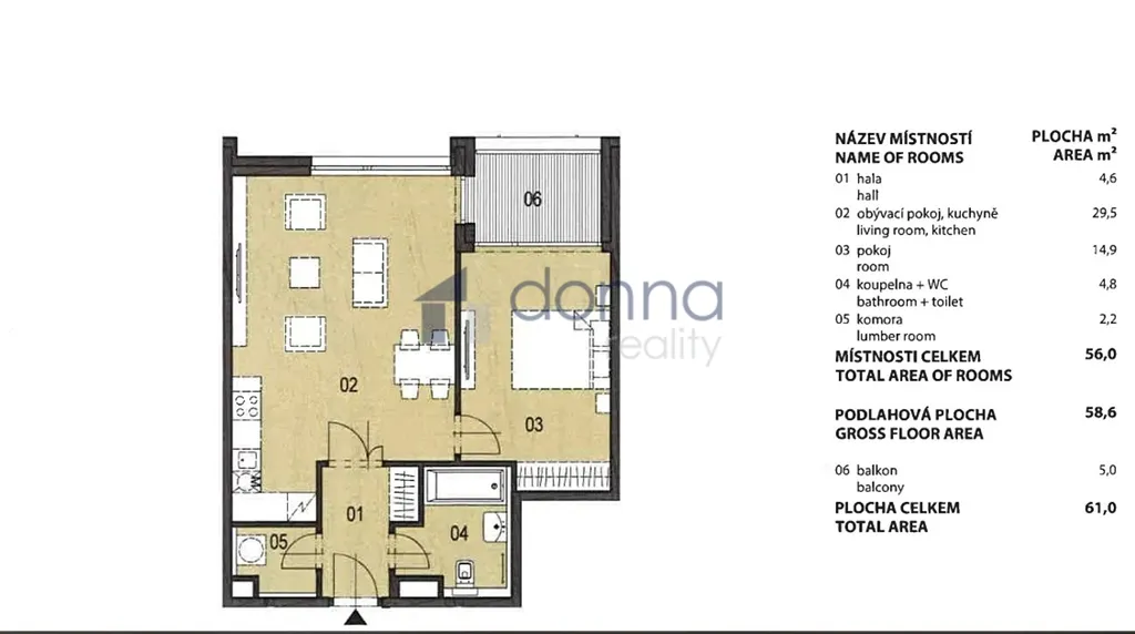 Obývací pokoj s kuchyňskou linkou, ložnicí, koupelnou a komorou. Kuchyňská linka s vestavěnými spotřebiči včetně myčky, indukční desky, kombinované trouby a lednice s mrazákem.