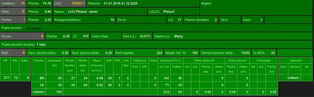 - p.č. 339/11 vedená jako lesní pozemek o celkové výměře 2 589 m2, vlastníme 5/12 podílu, tedy 1 079 m2 (zastoupení dřevin dle LHO bříza, olše, stáří lesa 82 let),