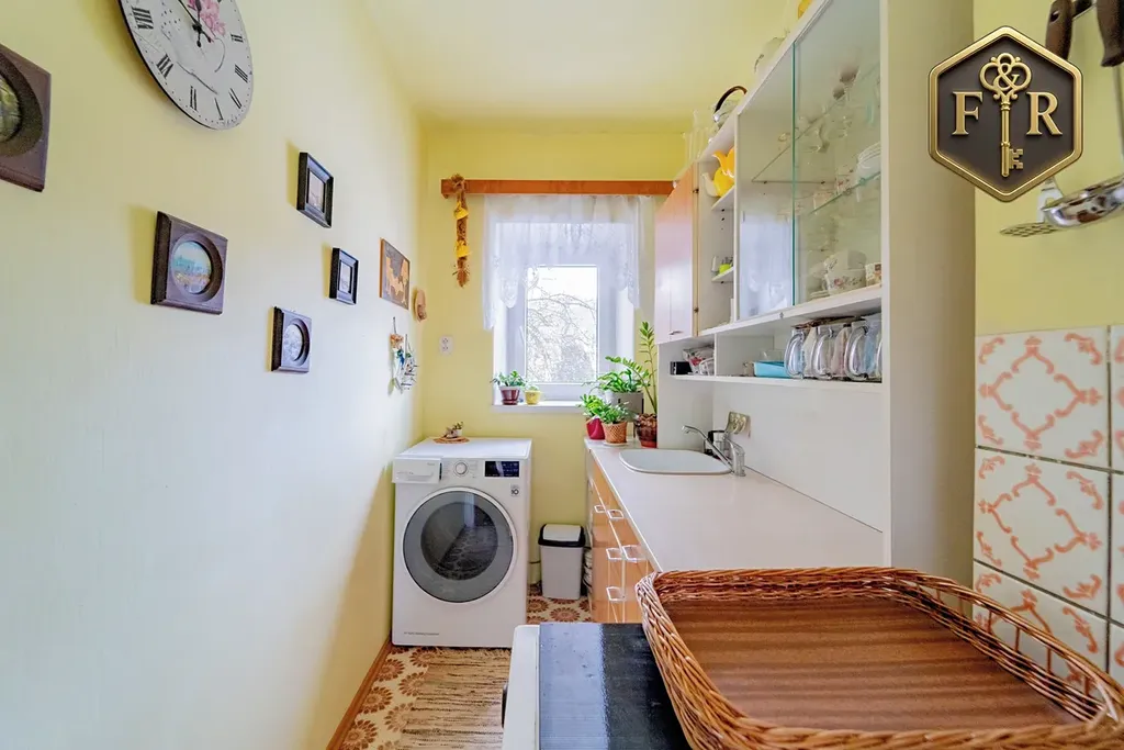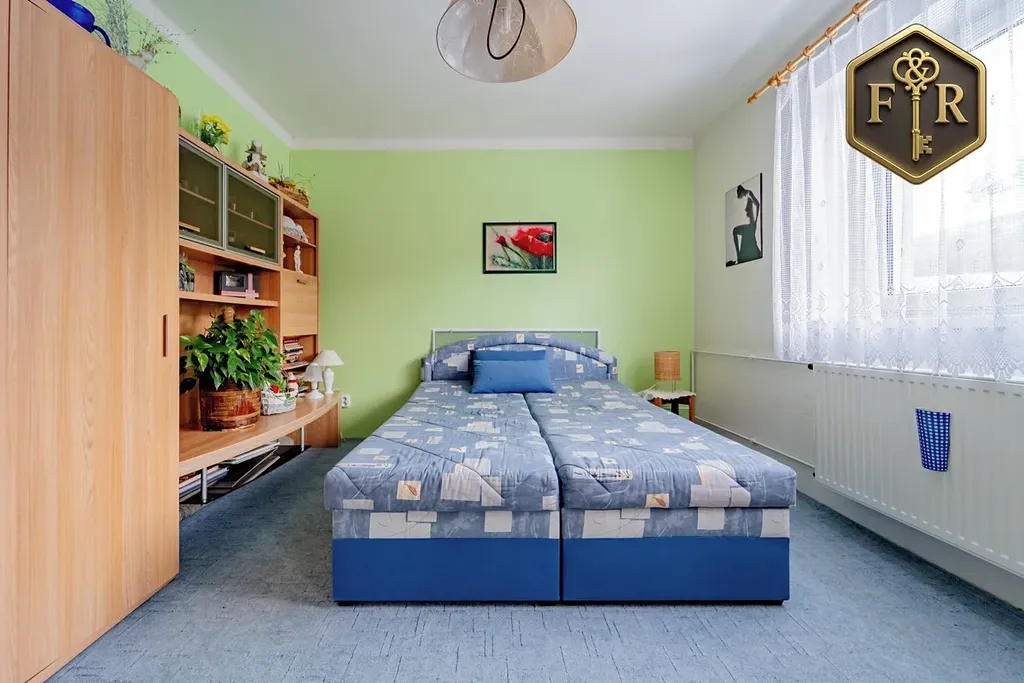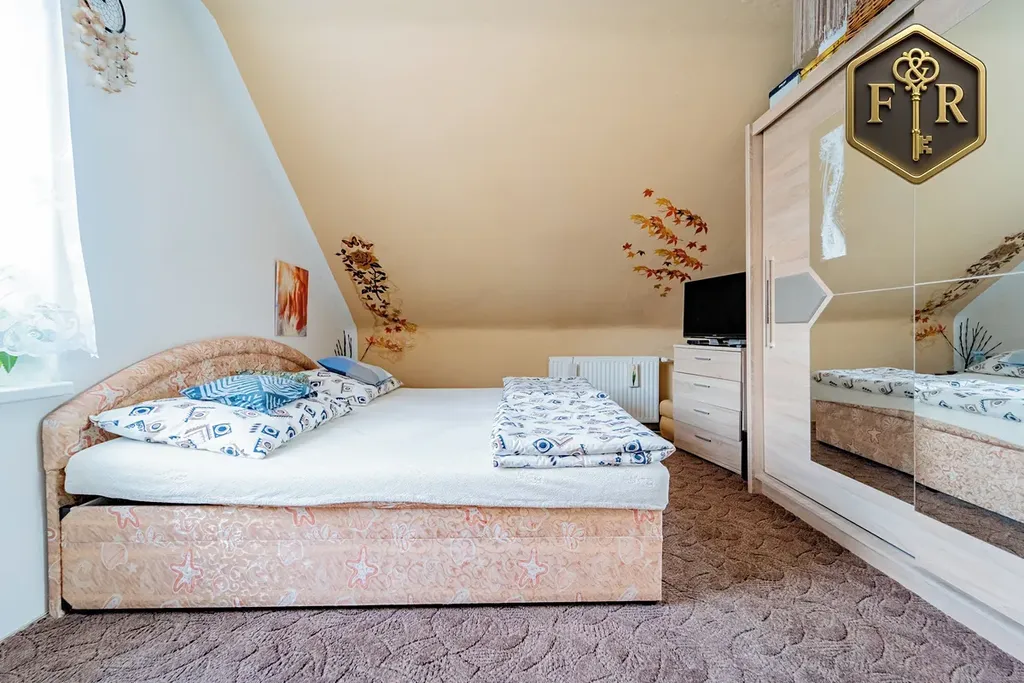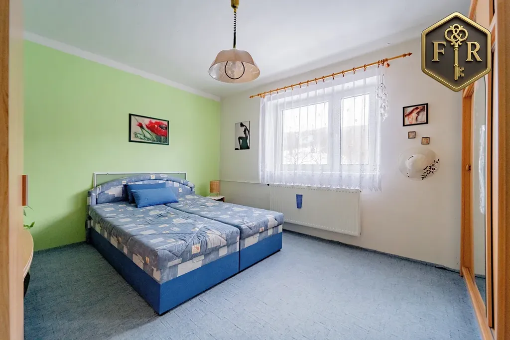 Dispozice domu je 5+kk (PP: sklady, kotelna; 1.NP: 2 pokoje, kuchyně, koupelna, WC; Podkroví: 3 pokoje, kuchyňský kout, balkon, WC)