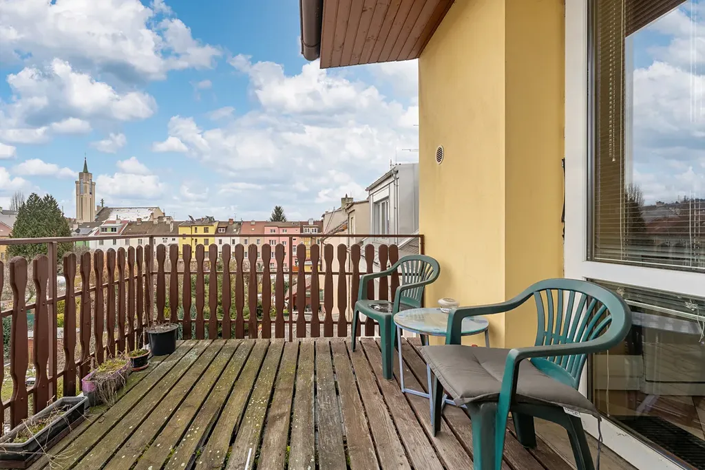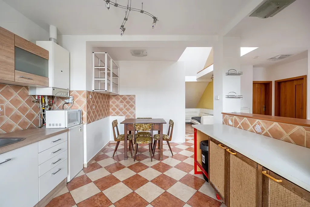 V bytě je mnoho dalšího úložného prostoru. Z kuchyně můžeme vejít na terasu o rozloze 10 m2, která nabízí příjemné posezení.
