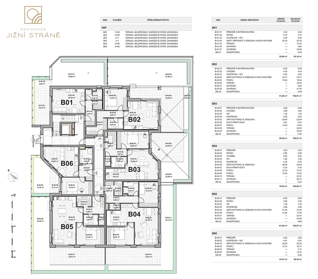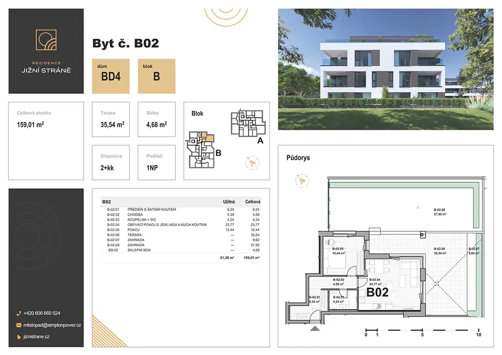 Jedná se o byt s označením BD4_B02 o dispozici 2+kk s celkovou plochou 159,01 m² (byt 51,28 m², terasa 35,54 m², zahrada 67,52 m² a sklep 4,68 m²) za cenu 6 951 000 Kč.