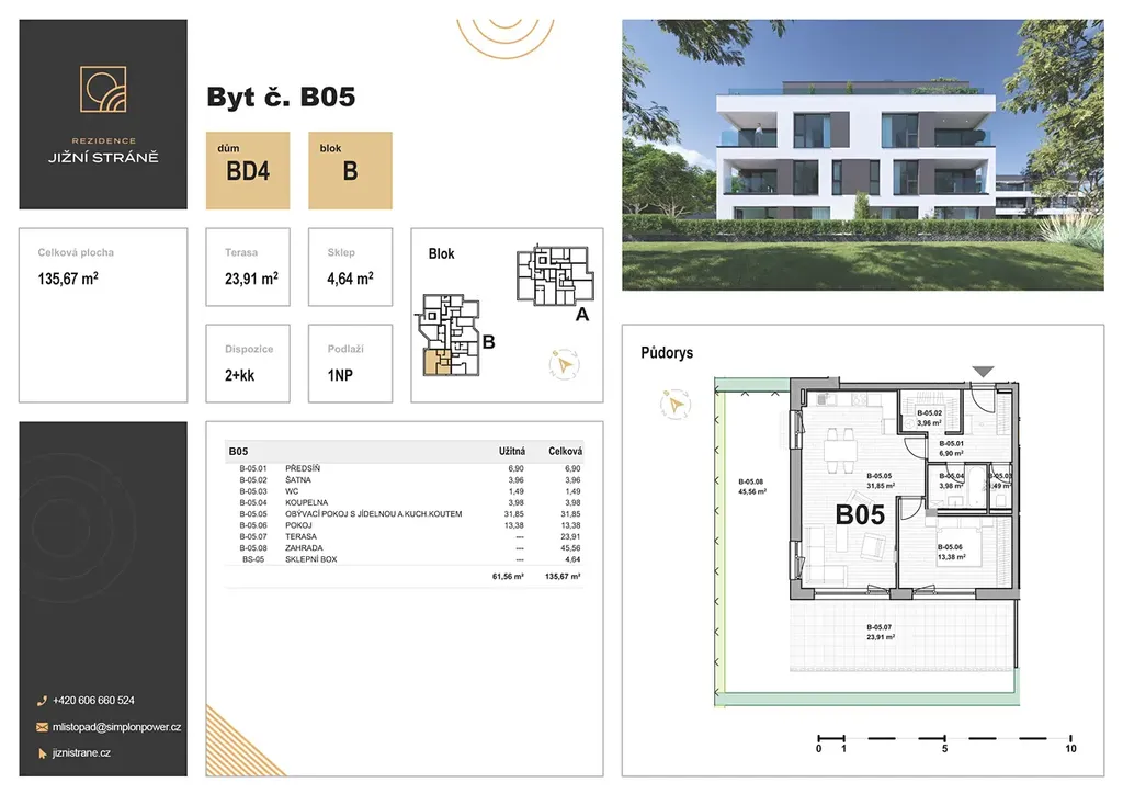 Druhý nabízený byt s označením BD4_B05 o dispozici 2+kk s celkovou plochou 135,67 m² (byt 61,56 m², terasa 23,91 m², zahrada 45,56 m², sklep 4,64 m²) za cenu 6 959 000 Kč.