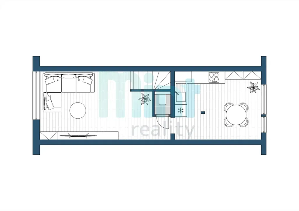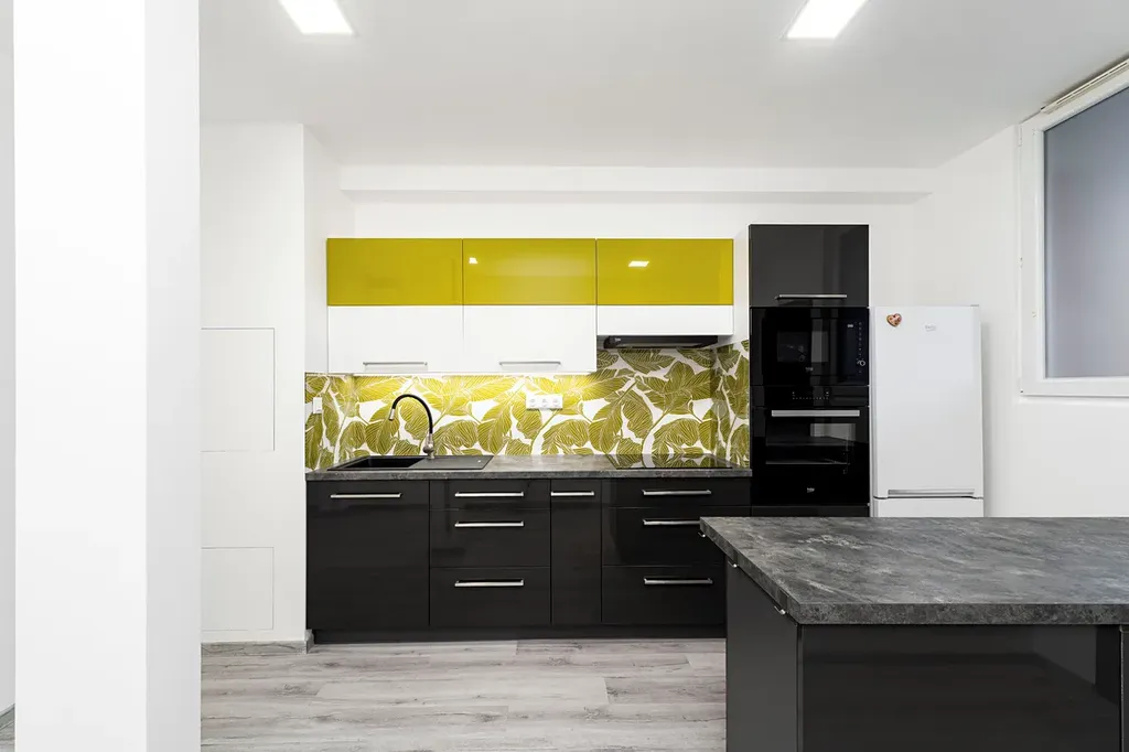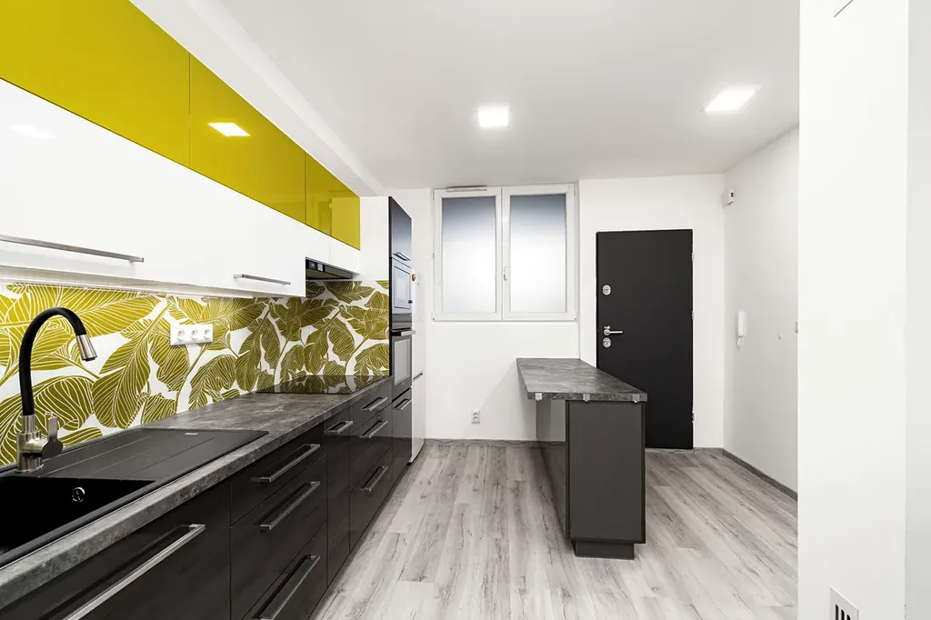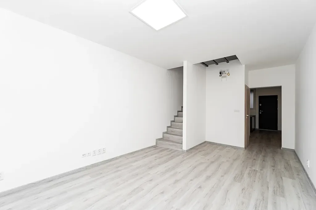 Byt je rozdělen do dvou úrovní. Po vstupu do bytu se ocitnete v útulné kuchyni, která je vybavena elektrickou indukční varnou deskou, vestavěnou elektrickou troubou a mikrovlnnou troubou. Disponuje také kuchyňským ostrůvkem, díky němu má kuchyň moderní vzhled a dostatek úložného místa. Kuchyň má také přípojky na myčku a pračku, což usnadňuje běžný provoz domácnosti. Ve spodní části bytu se nachází prostorný a slunný obývací pokoj, ideální pro odpočinek a rodinné posezení, a toaleta.