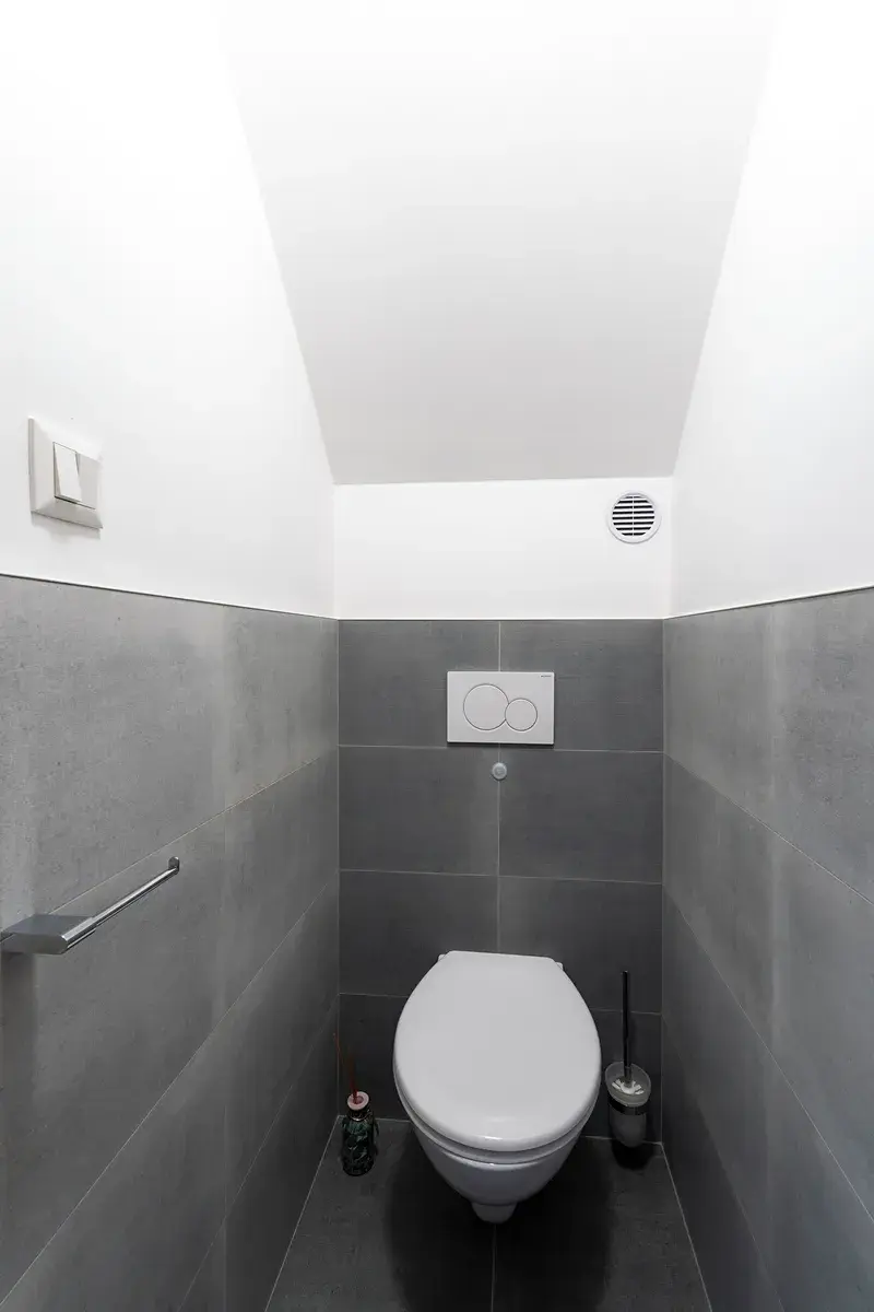Horní část bytu nabízí dva pokoje, které poskytují dostatek soukromí. Z jednoho z těchto pokojů je přístup na zasklenou lodžii, která je skvělým místem pro relaxaci a užívání si výhledu do okolí. Koupelna je vybavena moderním sprchovým koutem, umyvadlem a je zde také umístěna toaleta.