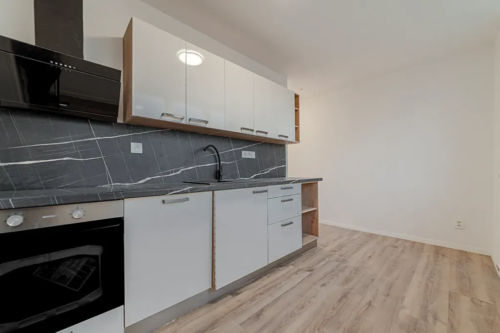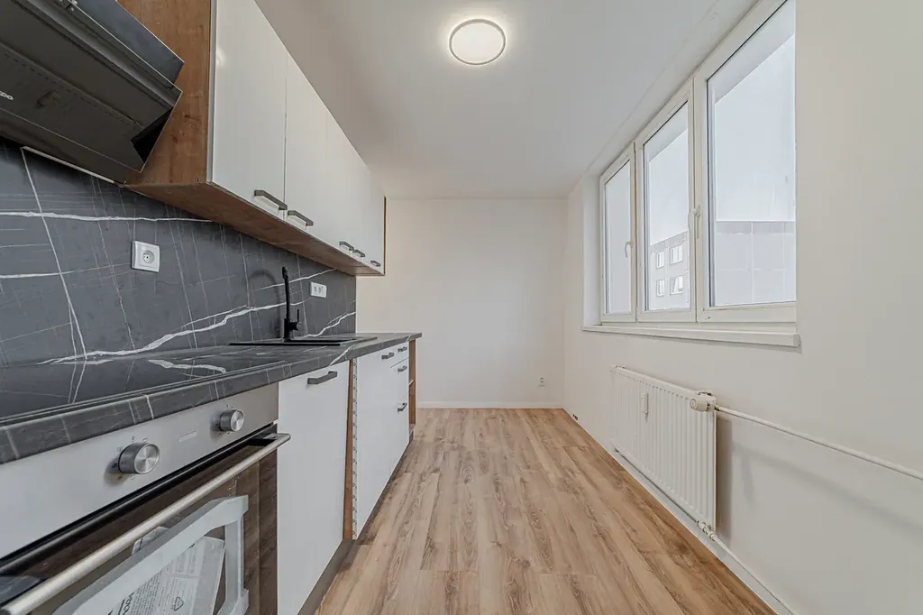 Nová kuchyňská linka s novými vestavěnými spotřebiči v záruce značky Mora, včetně vestavěné myčky a elektrické indukční varné desky. Koupelna má nově vybudované jádro a disponuje vanou a umyvadlem, závěsná toaleta oddělena.
