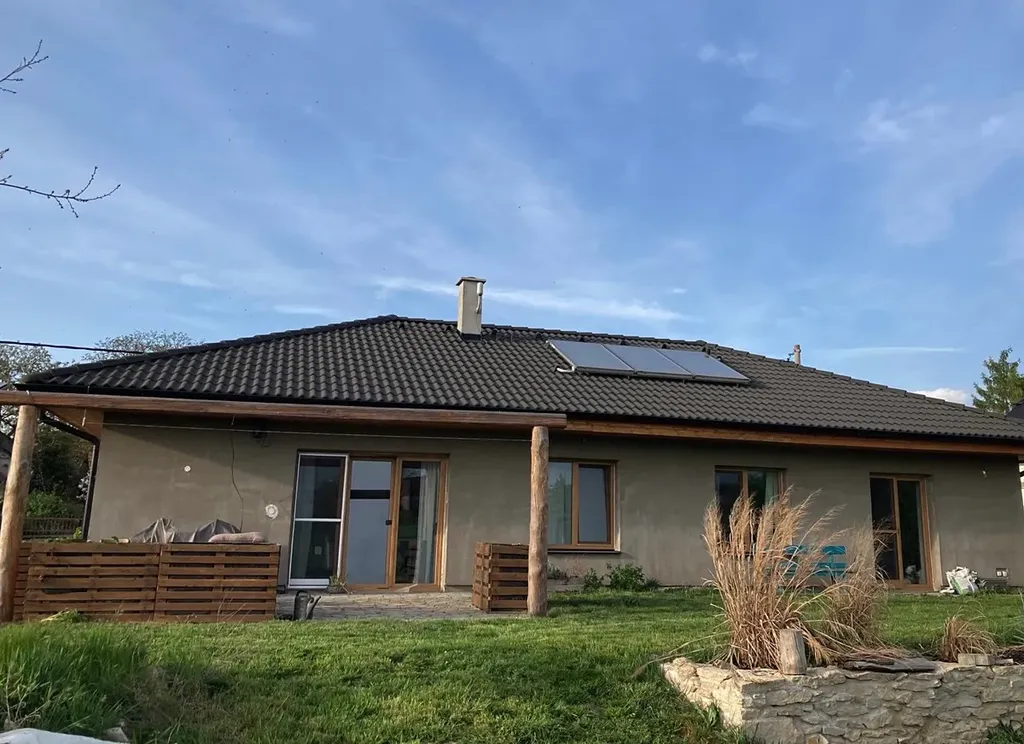 Solární panely, ohřev vody i topení elektrické. V domě jsou i kamna na topení dřevem.