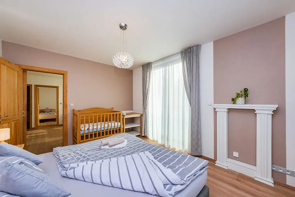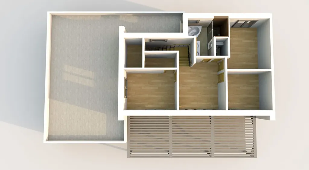 Patro nabízí samostatnou ložnici 15,7 m² s prostornou šatnou 7,1 m², dva samostatné pokoje (12,2 a 15,5 m²), velkou koupelnu s vanou, sprchovým koutem a WC. Dominantou patra je atrium (17,2 m²) orientované do zahrady, které poskytuje klidné místo k odpočinku, nebo je z něj možné vytvořit další samostatný pokoj.