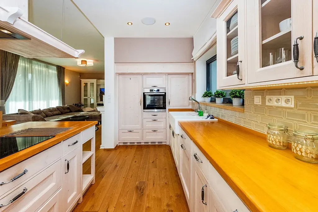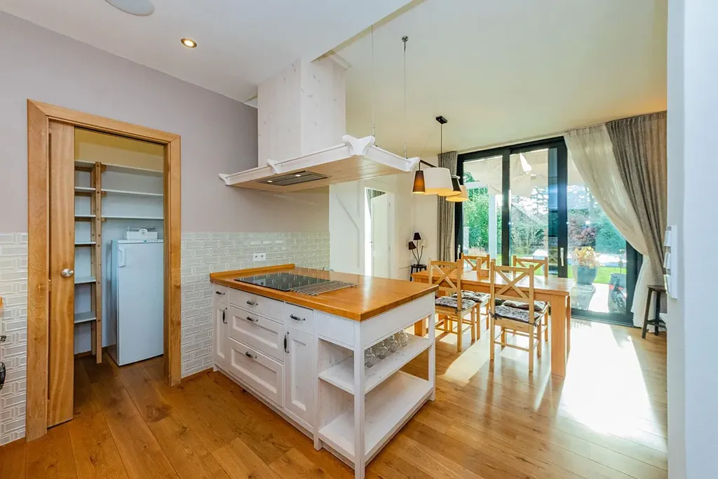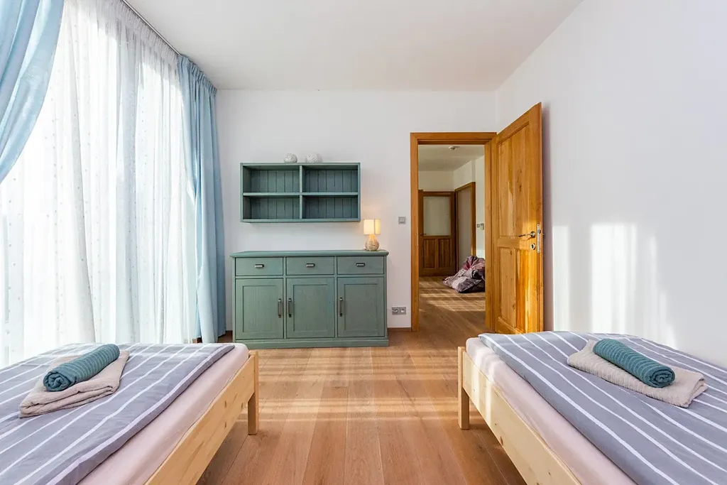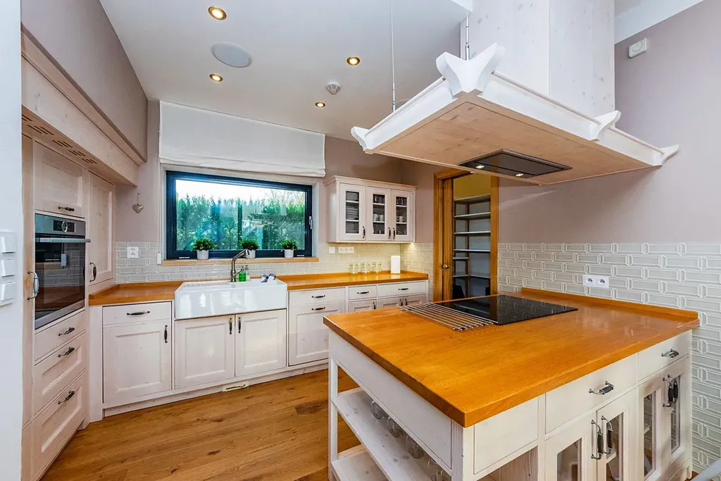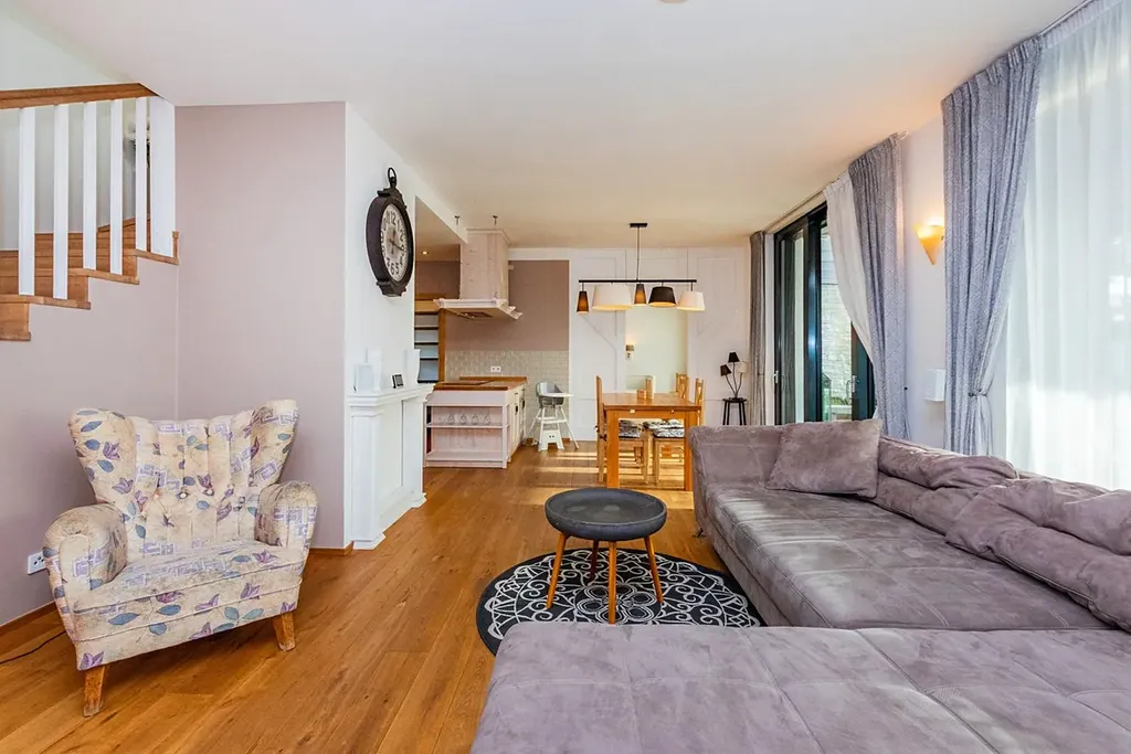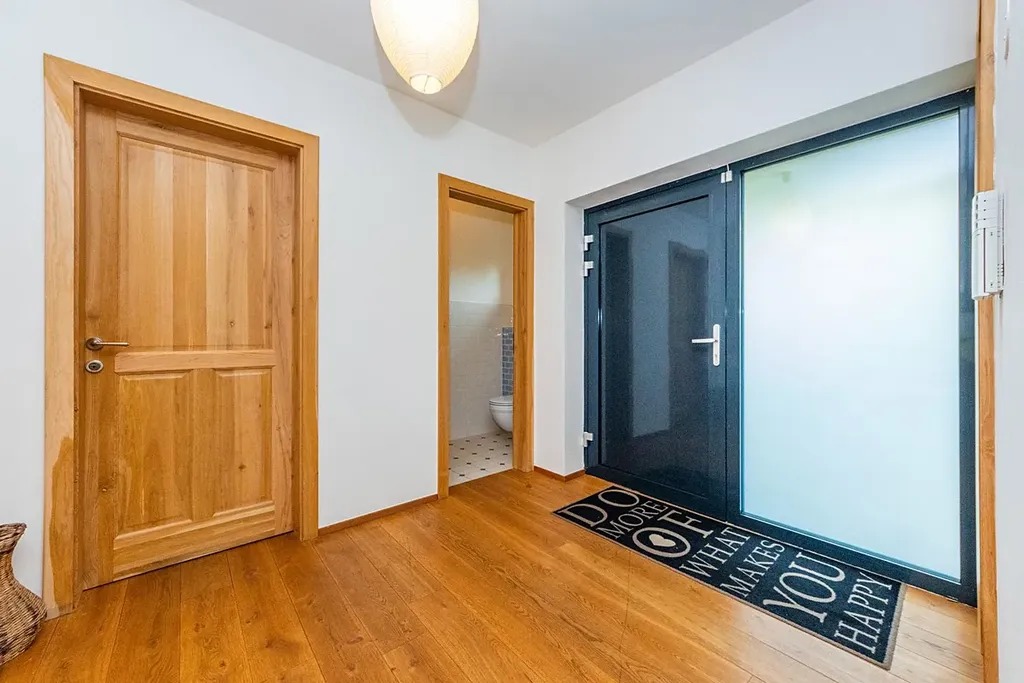V celém domě dominují masivní dřevěné podlahy a nadstandardní velikost hliníkových oken. Architektura je navržena s důrazem na komfortní rodinné bydlení, úsporný provoz a nadčasový design.