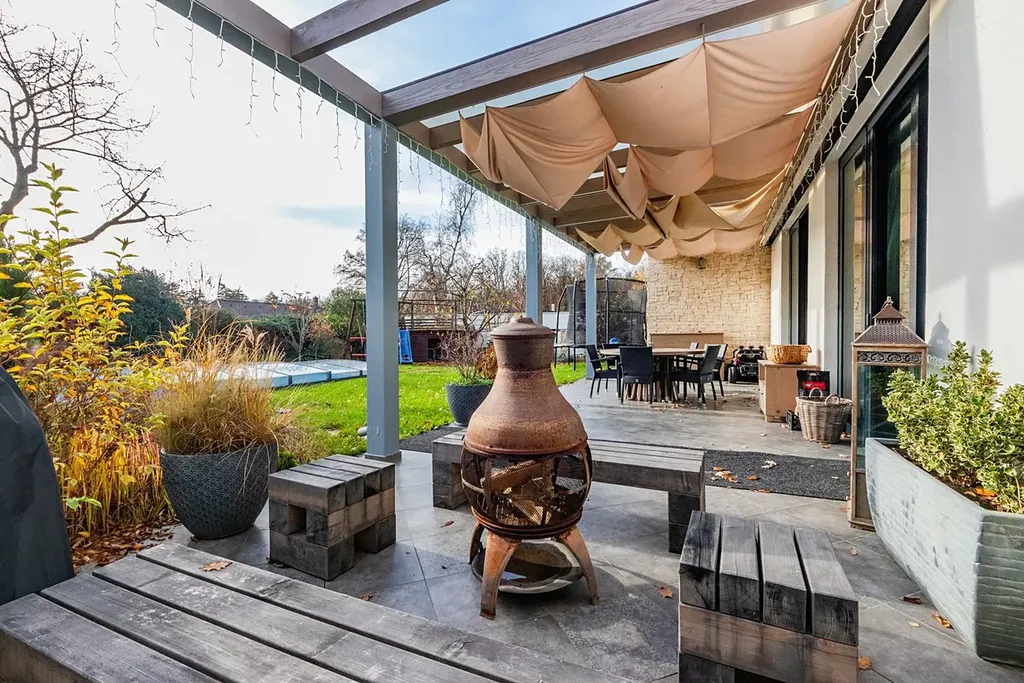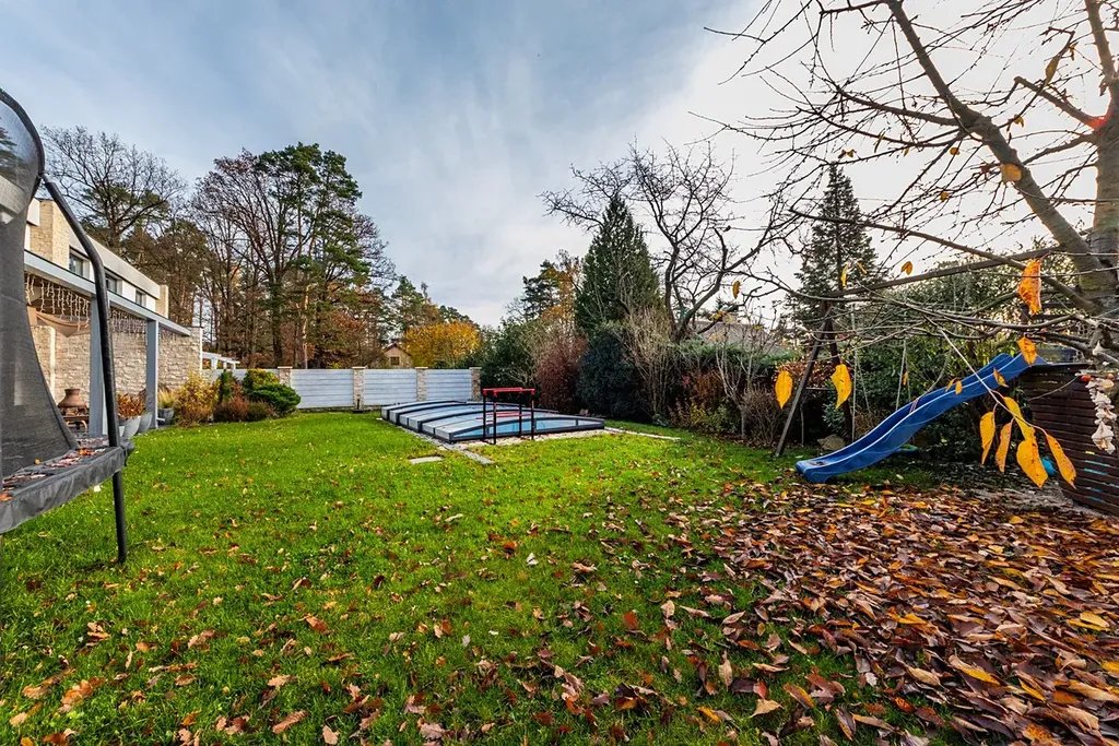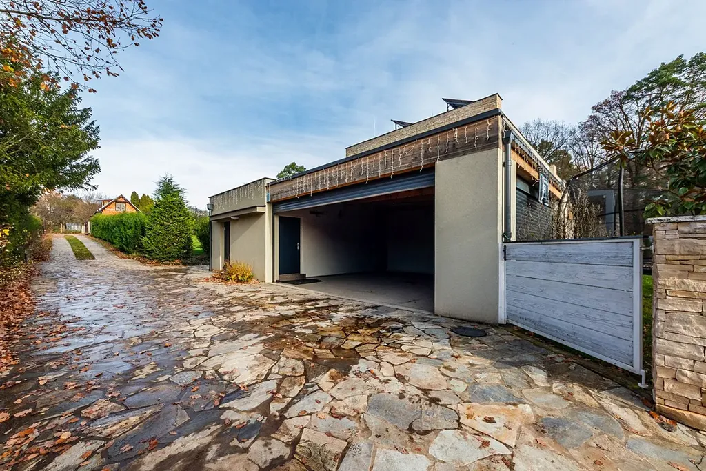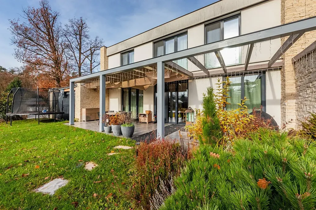 Zahrada orientovaná na jih poskytuje soukromí, klid a dostatek prostoru pro rodinné zázemí, venkovní posezení či okrasné prvky. Moderní bílá fasáda s velkými prosklenými plochami dává domu elegantní a vzdušný charakter.