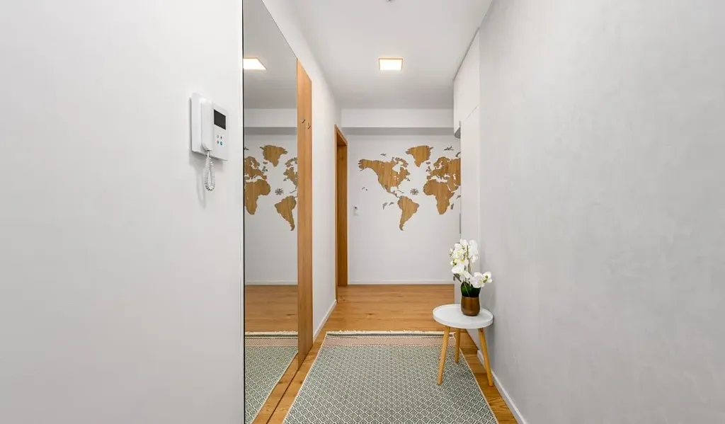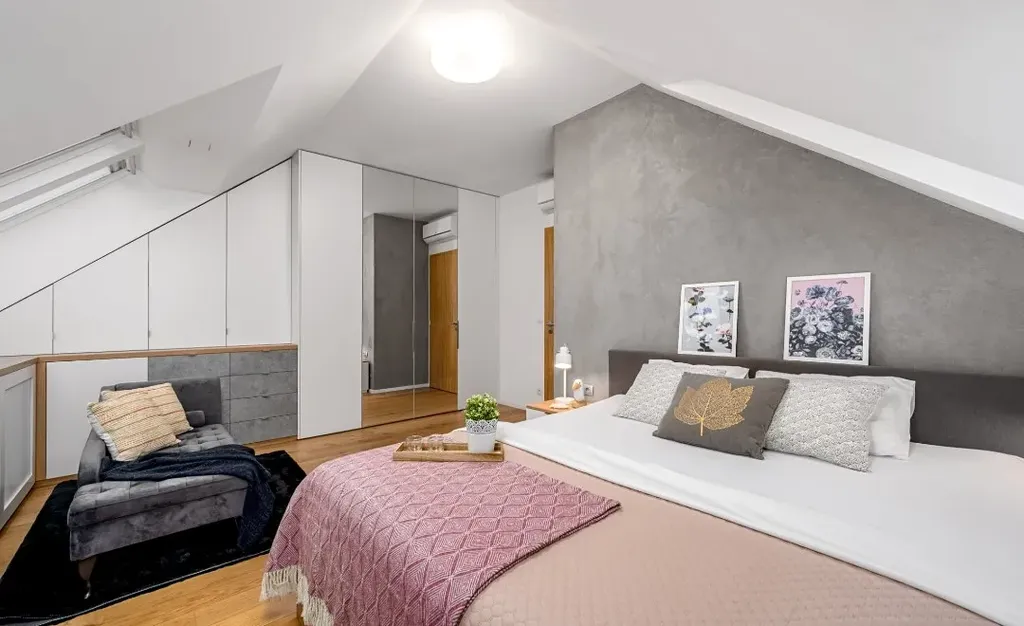 Důraz byl kladen také na dostatek úložných prostor. V bytě jsou instalovány vestavěné skříně a praktické úložné systémy, které zajišťují maximální komfort každodenního bydlení. Součástí bytu je rovněž samostatná komora vybavená pračkou.