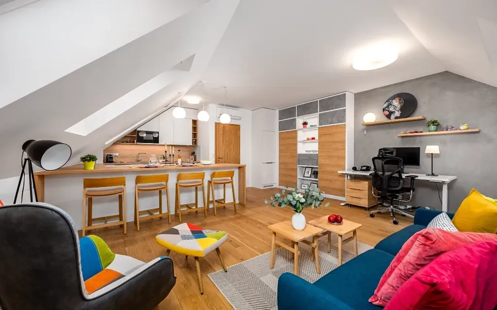 Byt splňuje nároky na moderní a komfortní bydlení ve vysokém standardu. Dominantou interiéru je designová kuchyňská linka vyrobená na míru, vybavená kvalitními vestavěnými spotřebiči – lednicí s mrazákem, indukční varnou deskou, horkovzdušnou troubou, vinotékou, myčkou nádobí a mikrovlnnou troubou.