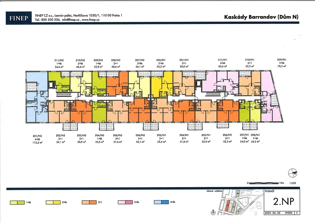 Byt, který bude světlý vzhledem k velikosti oken, je situovaný ve 2. nadzemním podlaží s orientací na západ a bude se skládat ze vstupní chodby, koupelny se sprchovým koutem, obytné místnosti s místem pro kuchyňskou linkou (23 m2) a dále z lodžie.