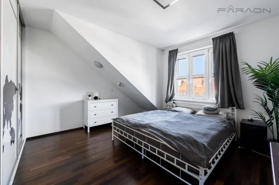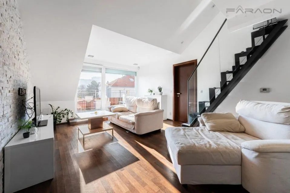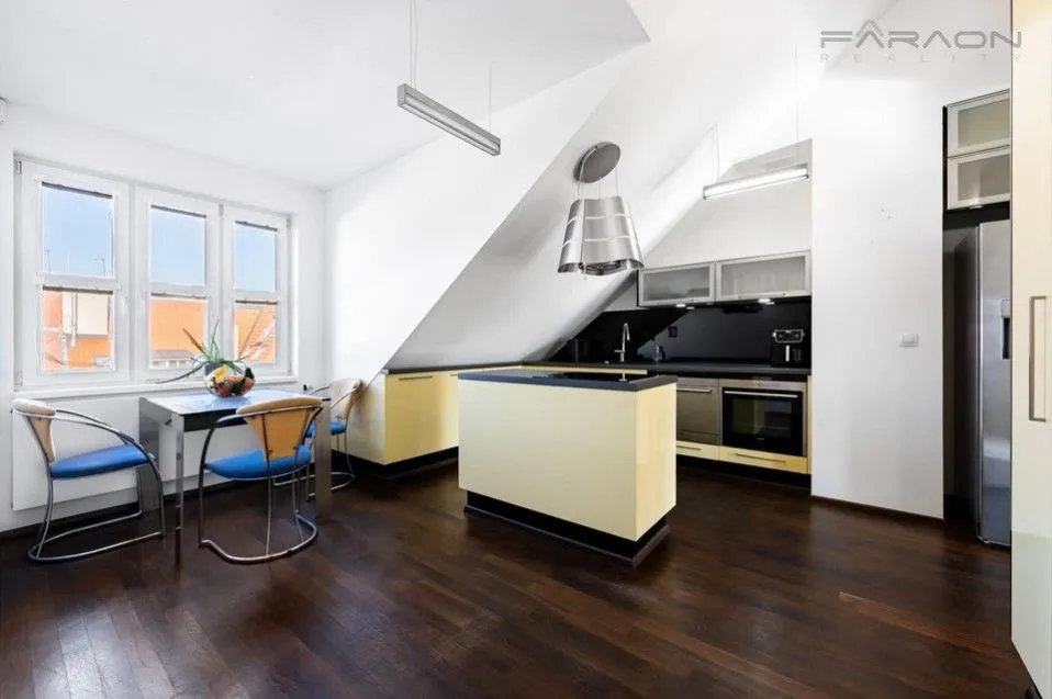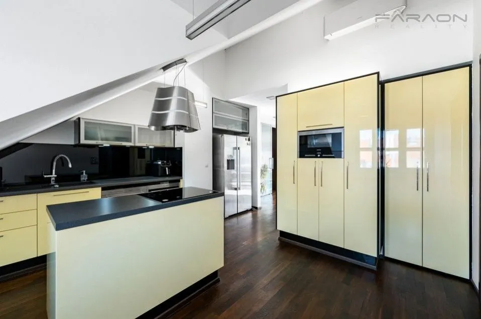 Pronájem částečně vybaveného klimatizovaného bytu 3+1 (124 m2) s loftem, terasou (11 m2) a sklepem (4 m2), v šestém (nejvyšším) patře zrekonstruovaného činžovního domu s výtahem a společnou zahradou v klidném vnitrobloku, nedaleko od parku Jezerka, Praha 4 - Nusle.