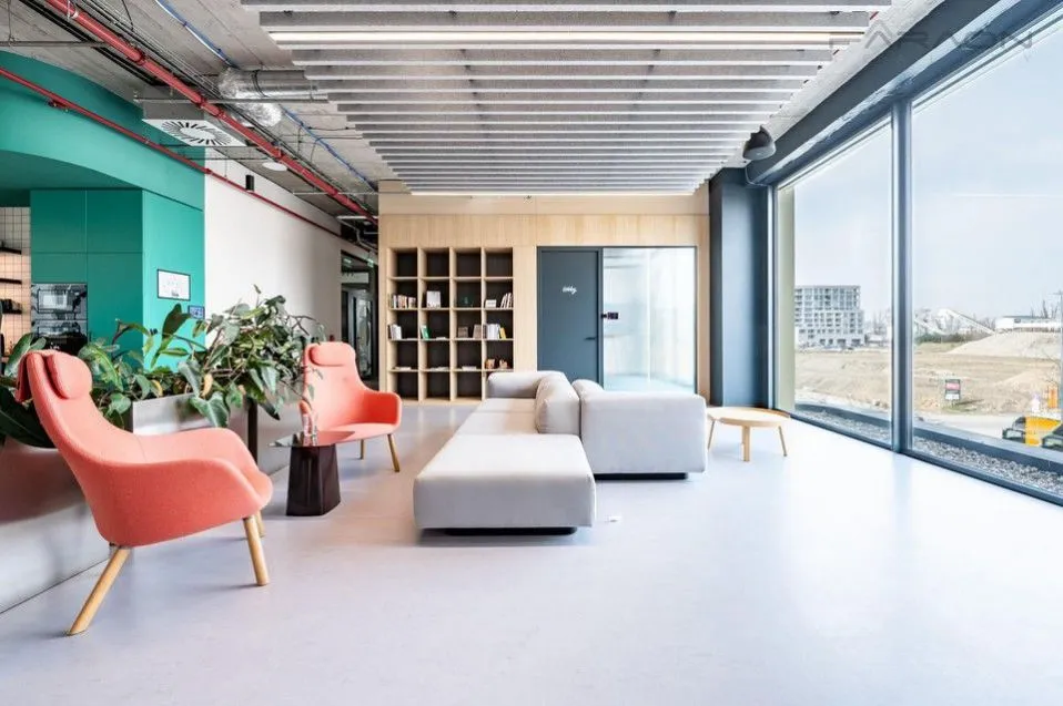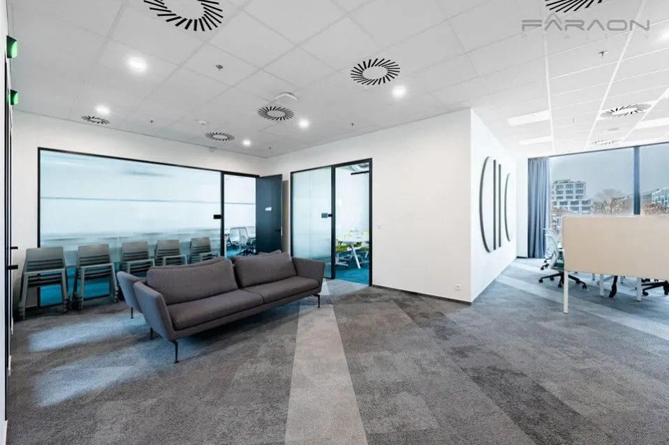 Interiér byl navržen s důrazem na reprezentativní vzhled a maximální efektivitu. Kanceláře jsou kompletně osazeny špičkovým nábytkem značky Vitra a doplněny zakázkovými prvky od společnosti BRICK, včetně na míru zhotovené kuchyně. Světlý, klimatizovaný open-space nabízí 88 plnohodnotných pracovních míst.