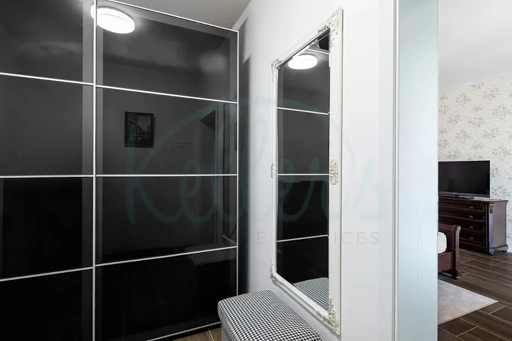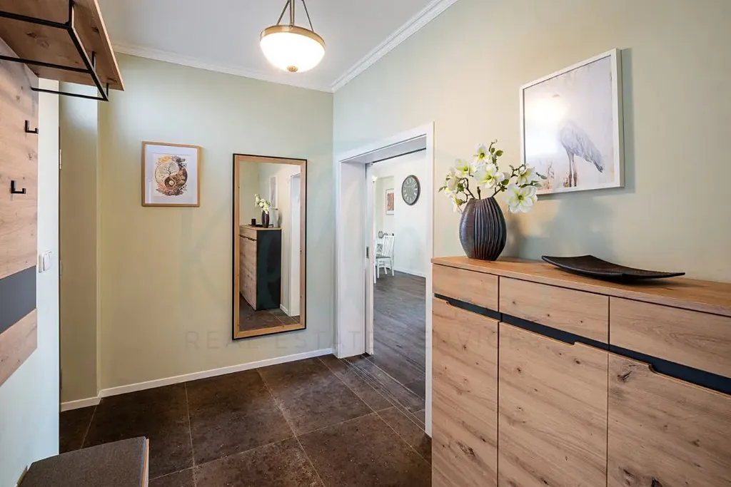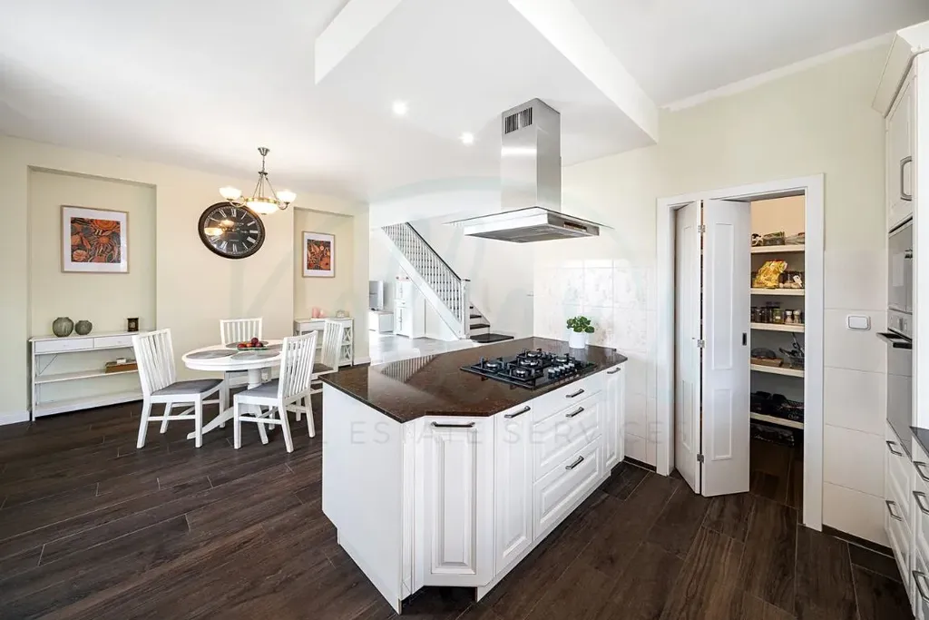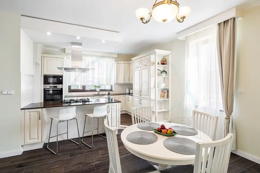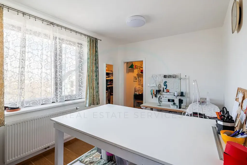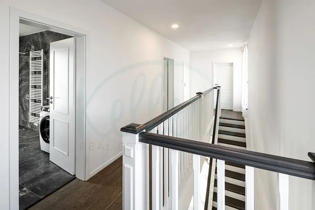 Dům nabízí velkorysou podlahovou plochu přibližně 244 m². Dominantou přízemí je světlý obývací prostor propojený s kuchyní a jídelnou, odkud je přímý vstup na terasu a do zahrady. Dále je zde ložnice s vlastní koupelnou a šatnou, samostatné WC, vstupní předsíň, technická místnost a garáž pro dva vozy. V patře se nachází další tři pokoje, koupelna a dvě šatny, přičemž z pokojů je přístup na balkony a terasu s výhledem do okolí. V ceně domu je kuchyňská linka s pracovní deskou z umělého kamene a spotřebiči značky Bosch. Dům se nabízí bez nábytku, což novému majiteli umožňuje přizpůsobit si interiér přesně podle vlastních představ.