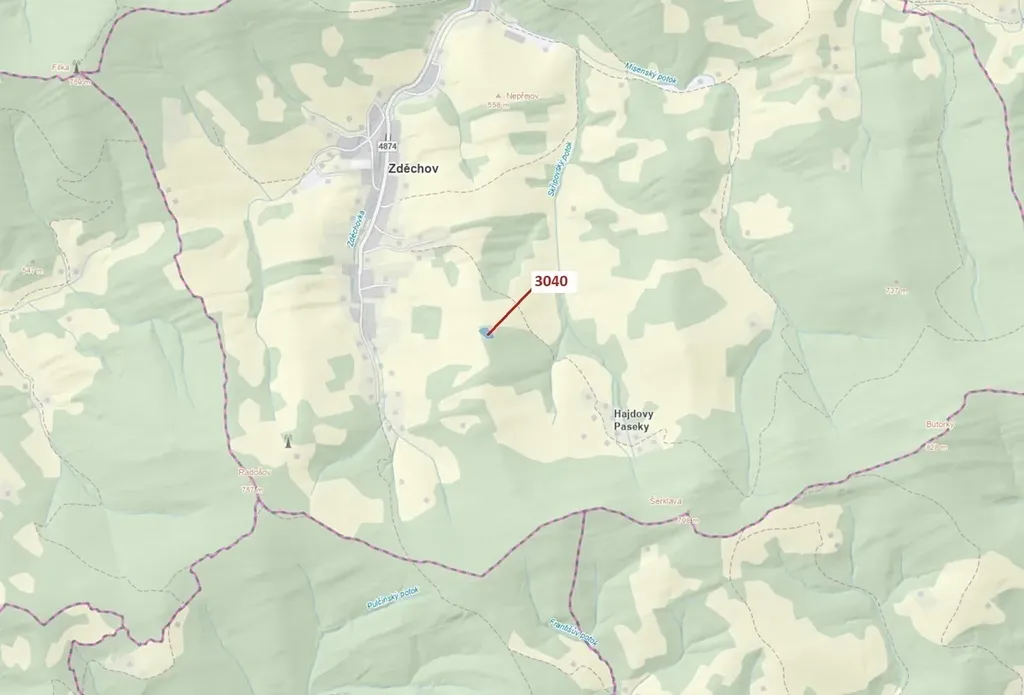 Lesní pozemek o výměře 2428 m2, parcelní číslo 3040, podíl 1/1, katastrální území Zděchov, obec Zděchov, obec s rozšířenou působností Vsetín, okres Vsetín, Zlínský kraj.