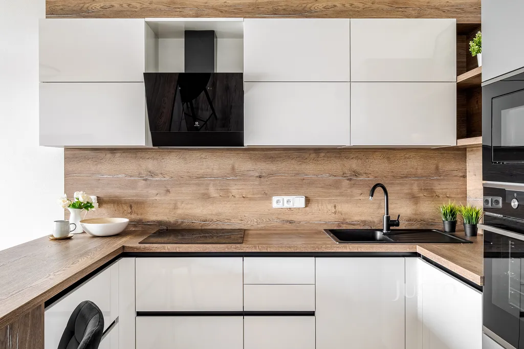 Moderní kuchyňská linka je kompletně vybavena všemi spotřebiči – lednicí, indukční varnou deskou, troubou, mikrovlnkou a myčkou. Interiér dává důraz na dřevěné dekory a kvalitní provedení detailů. Majitelka byt vybavila vestavěným nábytkem. V obývací části můžete své oblíbené pořady sledovat na velké TV. Z obýváku vedou dveře na jižně orientovanou lodžii s výhledem na okolní zástavbu.