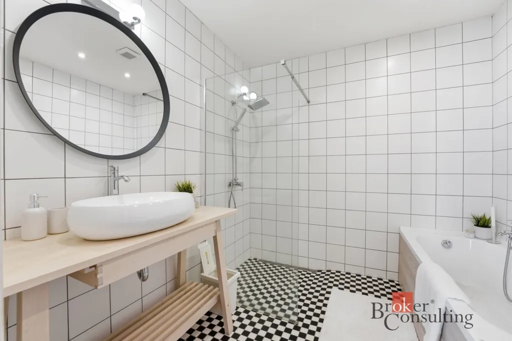 Díky vysokým stropům a velkým oknům je byt vzdušný a prosvětlený. Interiér kombinuje dřevěné podlahy, světlé stěny a moderní vybavení, což vytváří příjemnou a nadčasovou atmosféru.