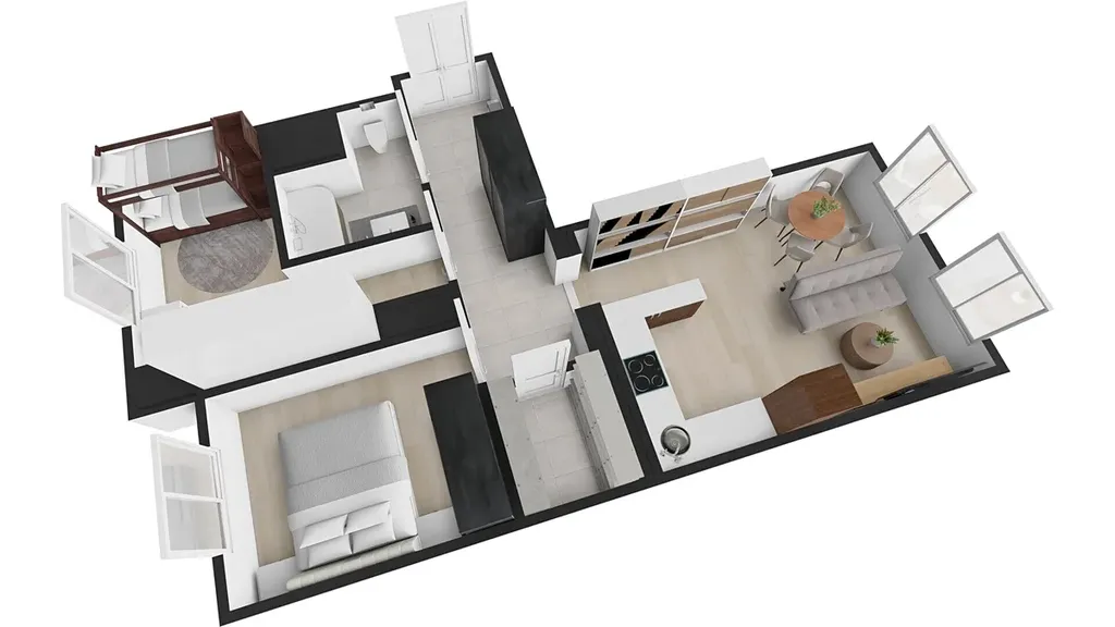 Dispozici bytu tvoří tři samostatné neprůchozí místnosti, koupelna s toaletou a technická místnost.