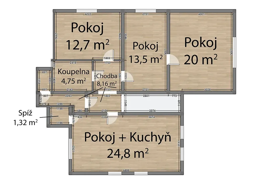 V prvním patře jsou potom 3 pokoje + obývák spojený s kuchyňským koutem a koupelna s toaletou.